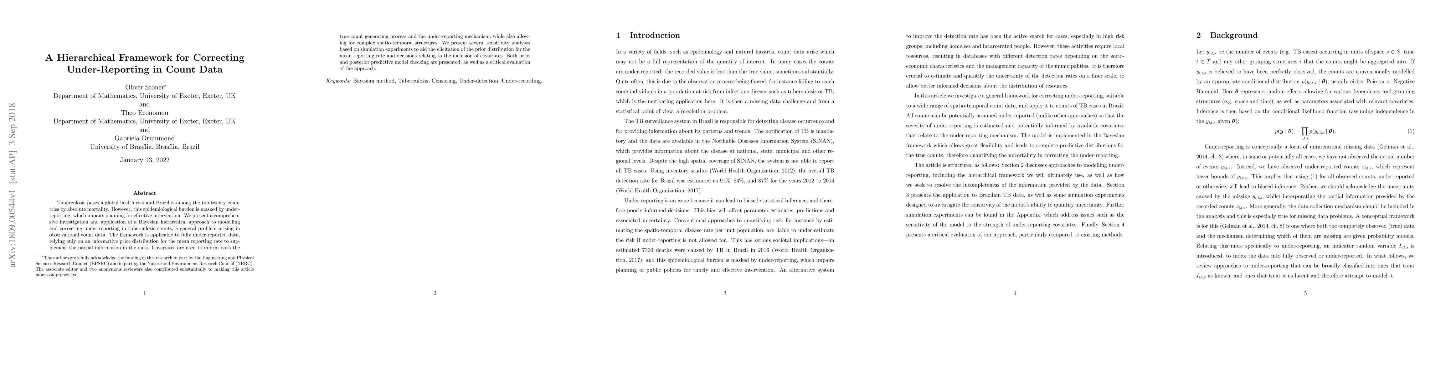 Researchers develop a Bayesian hierarchical framework to correct under-reporting in tuberculosis counts, providing a more accurate estimate of global mortality risks. The approach uses informative prior distributions and covariates to model the true count generating process and under-reporting mechanism.