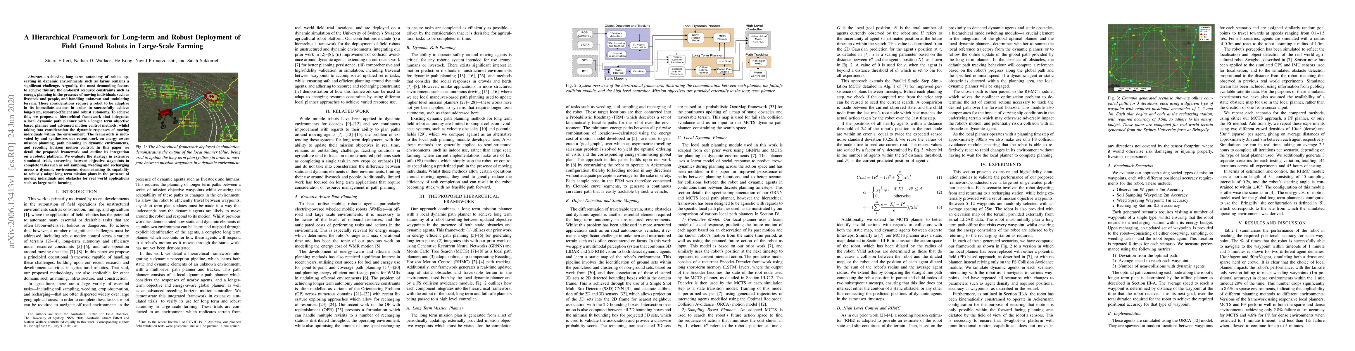 This paper proposes a hierarchical framework for long-term autonomous operation of field robots in dynamic farming environments, integrating local path planning, long-term objective planning, and advanced motion control to adapt to resource constraints, moving individuals, and unknown terrain. The framework is evaluated through extensive simulations demonstrating its effectiveness in tasks like soil sampling and weeding.