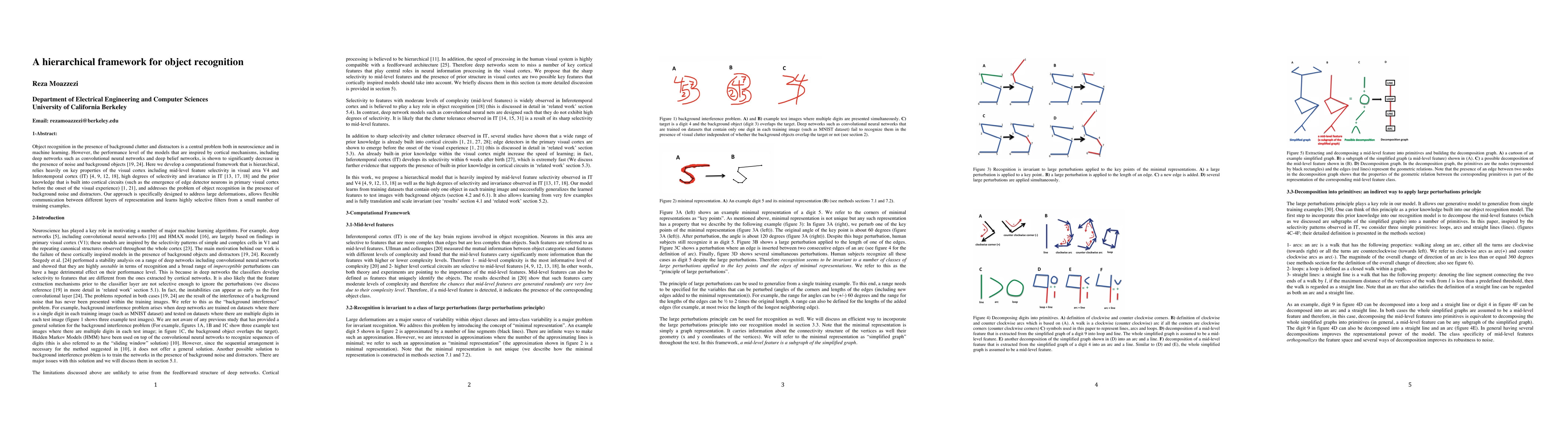 Object recognition in the presence of background clutter and distractors is a central problem both in neuroscience and in machine learning. However, the performance level of the models that are inspired by cortical mechanisms, including deep networks such as convolutional neural networks and deep belief networks, is shown to significantly decrease in the presence of noise and background objects [19, 24]. Here we develop a computational framework that is hierarchical, relies heavily on key properties of the visual cortex including mid-level feature selectivity in visual area V4 and Inferotemporal cortex (IT) [4, 9, 12, 18], high degrees of selectivity and invariance in IT [13, 17, 18] and the prior knowledge that is built into cortical circuits (such as the emergence of edge detector neurons in primary visual cortex before the onset of the visual experience) [1, 21], and addresses the problem of object recognition in the presence of background noise and distractors. Our approach is specifically designed to address large deformations, allows flexible communication between different layers of representation and learns highly selective filters from a small number of training examples.