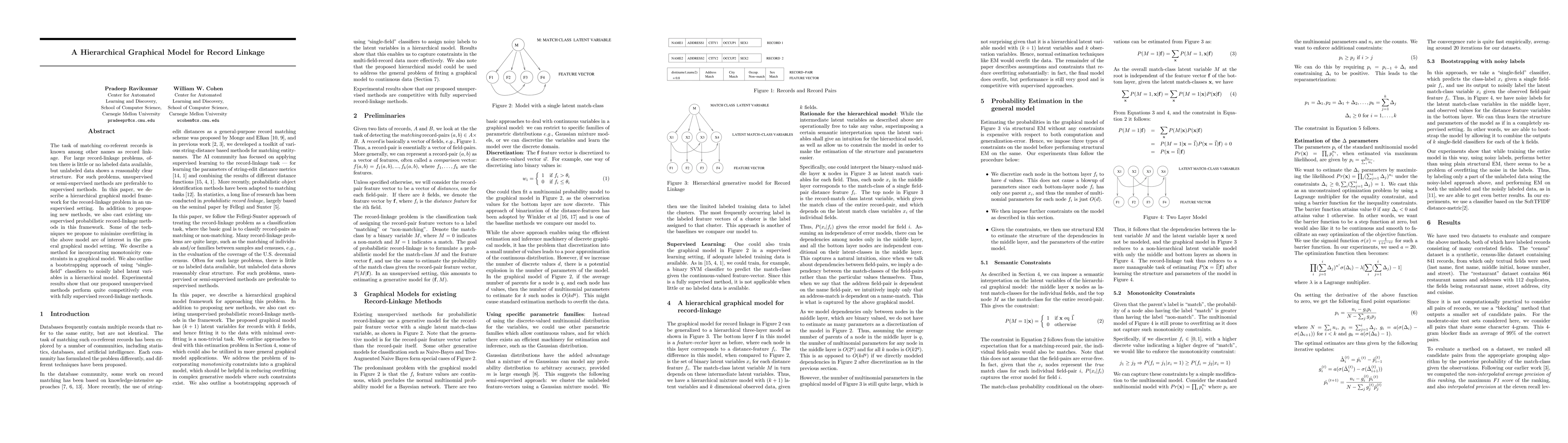 The paper proposes a hierarchical graphical model for record linkage, an unsupervised setting for matching co-referent records with limited or no labeled data. It generalizes existing unsupervised probabilistic methods and introduces new techniques to minimize overfitting, such as incorporating monotonicity constraints and a bootstrapping approach using single-field classifiers.