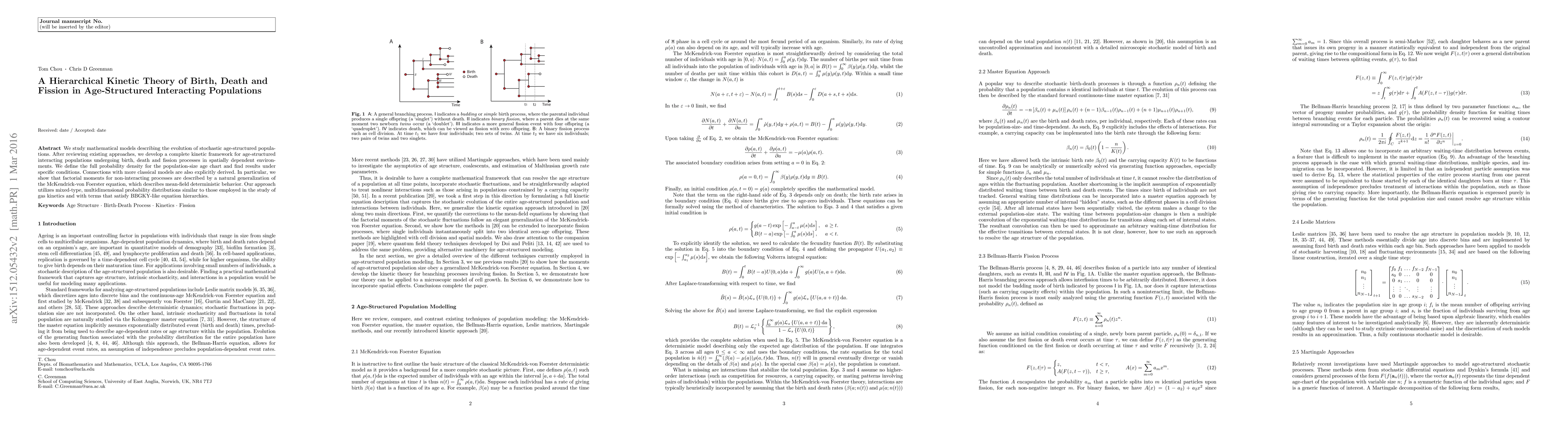 This paper develops a hierarchical kinetic theory for age-structured populations experiencing birth, death, and fission in spatially dependent environments. It introduces a comprehensive framework using mixed type, multi-dimensional probability distributions and BBGKY-like hierarchies, linking these models to classical McKendrick-von Foerster equations for mean-field deterministic behavior.