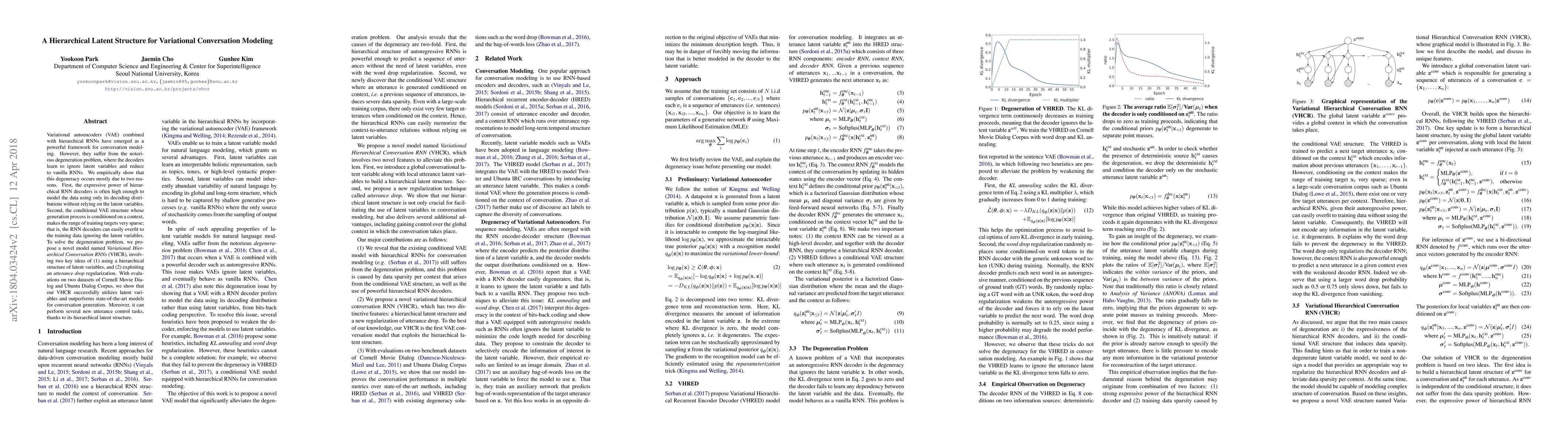 The paper introduces Variational Hierarchical Conversation RNNs (VHCR) to address the degeneration problem in variational autoencoders for conversation modeling, proposing a hierarchical latent structure and utterance drop regularization to improve performance. VHCR outperforms existing models and enables new utterance control tasks on movie and Ubuntu dialog datasets.