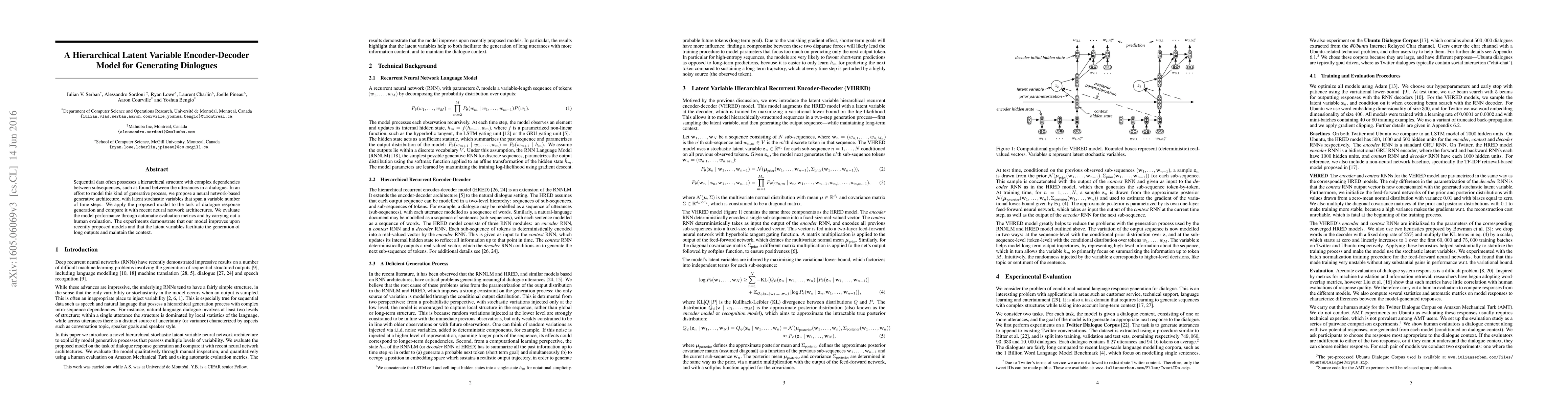 This paper proposes a hierarchical latent variable encoder-decoder model for generating dialogues, showing improved performance over recent neural architectures through both automatic metrics and human evaluation. The model's latent variables enhance the generation of long, contextually coherent responses.