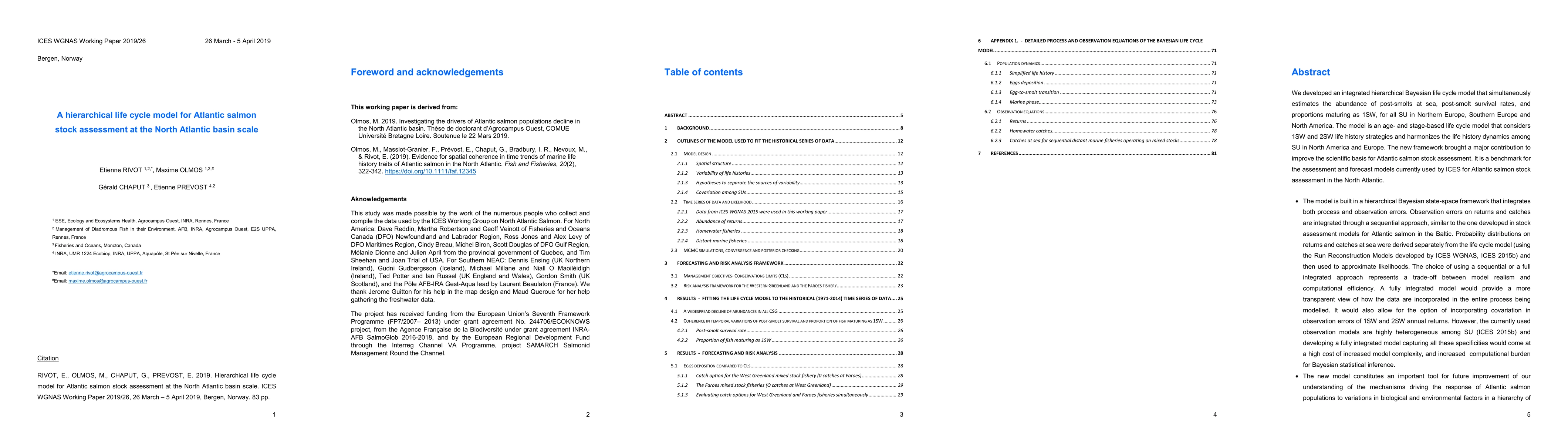 We developed an integrated hierarchical Bayesian life cycle model that simultaneously estimates the abundance of post-smolts at sea, post-smolt survival rates, and proportions maturing as 1SW, for all SU in Northern Europe, Southern Europe and North America. The model is an age- and stage-based life cycle model that considers 1SW and 2SW life history strategies and harmonizes the life history dynamics among SU in North America and Europe. The new framework brought a major contribution to improve the scientific basis for Atlantic salmon stock assessment. It is a benchmark for the assessment and forecast models currently used by ICES for Atlantic salmon stock assessment in the North Atlantic. ...