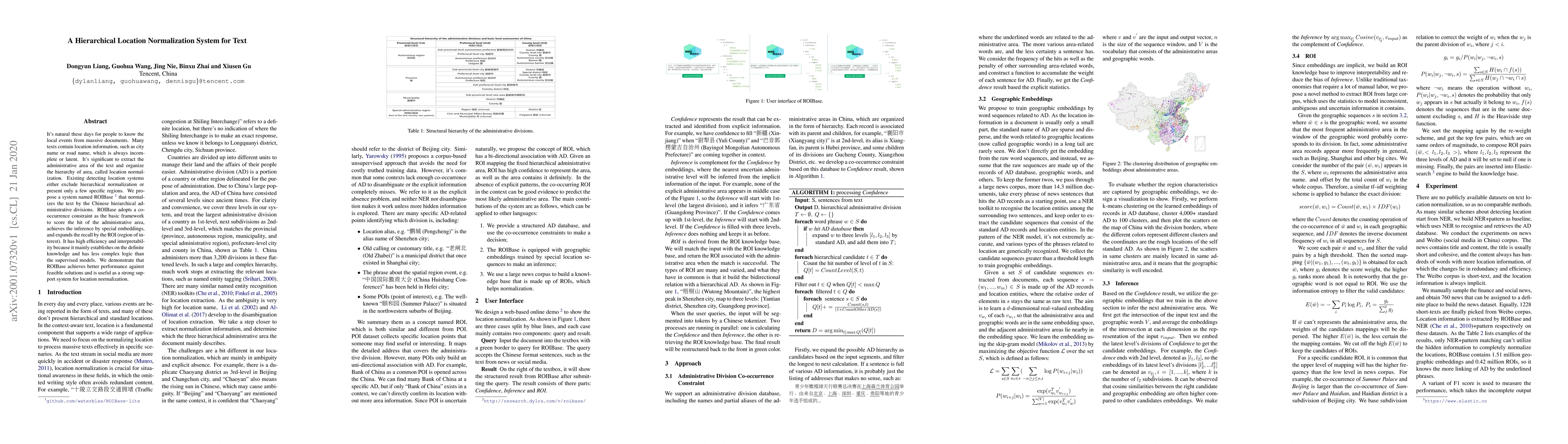 This paper proposes ROIBase, a hierarchical location normalization system for text based on Chinese administrative divisions. It uses co-occurrence constraints and special embeddings to efficiently and interpretably identify and organize location hierarchies, outperforming existing solutions.