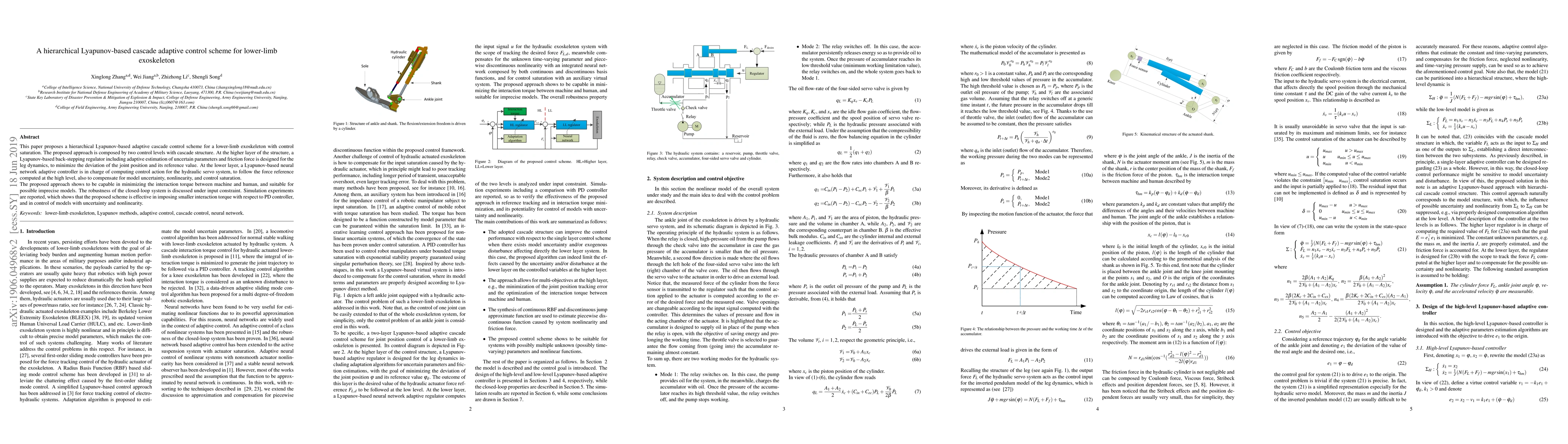 This paper proposes a hierarchical Lyapunov-based adaptive cascade control scheme for a lower-limb exoskeleton with control saturation. The proposed approach is composed by two control levels with cascade structure. At the higher layer of the structure, a Lyapunov-based back-stepping regulator including adaptive estimation of uncertain parameters and friction force is designed for the leg dynamics, to minimize the deviation of the joint position and its reference value. At the lower layer, a Lyapunov-based neural network adaptive controller is in charge of computing control action for the hydraulic servo system, to follow the force reference computed at the high level, also to compensate for model uncertainty, nonlinearity, and control saturation. The proposed approach shows to be capable in minimizing the interaction torque between machine and human, and suitable for possible imprecise models. The robustness of the closed-loop system is discussed under input constraint. Simulation experiments are reported, which shows that the proposed scheme is effective in imposing smaller interaction torque with respect to PD controller, and in control of models with uncertainty and nonlinearity.