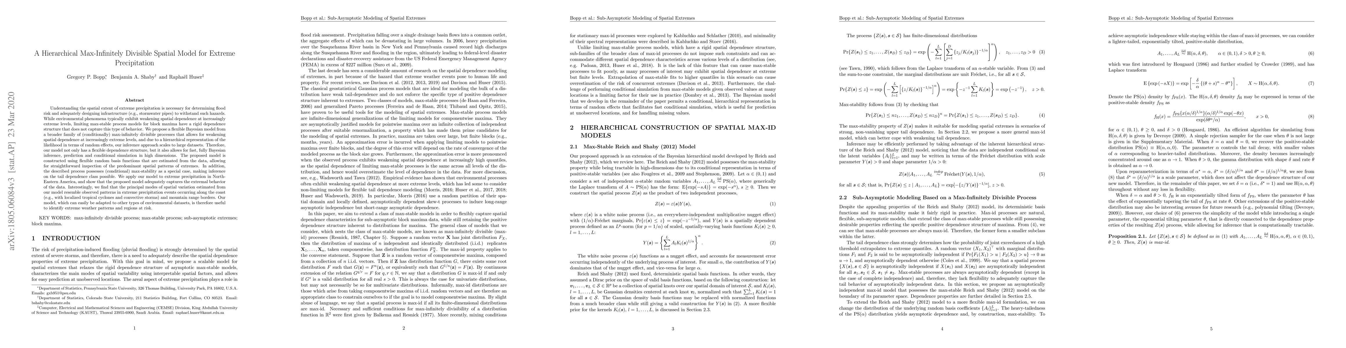 This paper proposes a hierarchical Bayesian model based on max-infinitely divisible processes to capture the spatial dependence of extreme precipitation, allowing for weakening dependence at higher levels. The model enables efficient inference and prediction, and is applied to North-Eastern American precipitation data, revealing coastal and mountain range patterns of extreme events.
