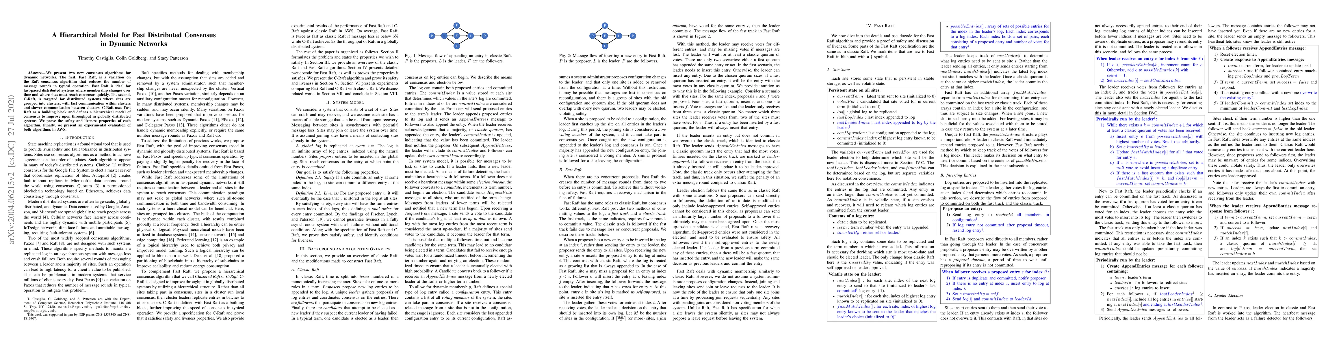 We present two new consensus algorithms for dynamic networks. The first, Fast Raft, is a variation on the Raft consensus algorithm that reduces the number of message rounds in typical operation. Fast Raft is ideal for fast-paced distributed systems where membership changes over time and where sites must reach consensus quickly. The second, C-Raft, is targeted for distributed systems where sites are grouped into clusters, with fast communication within clusters and slower communication between clusters. C-Raft uses Fast Raft as a building block and defines a hierarchical model of consensus to improve upon throughput in globally distributed systems. We prove the safety and liveness properties of each algorithm. Finally, we present an experimental evaluation of both algorithms in AWS.