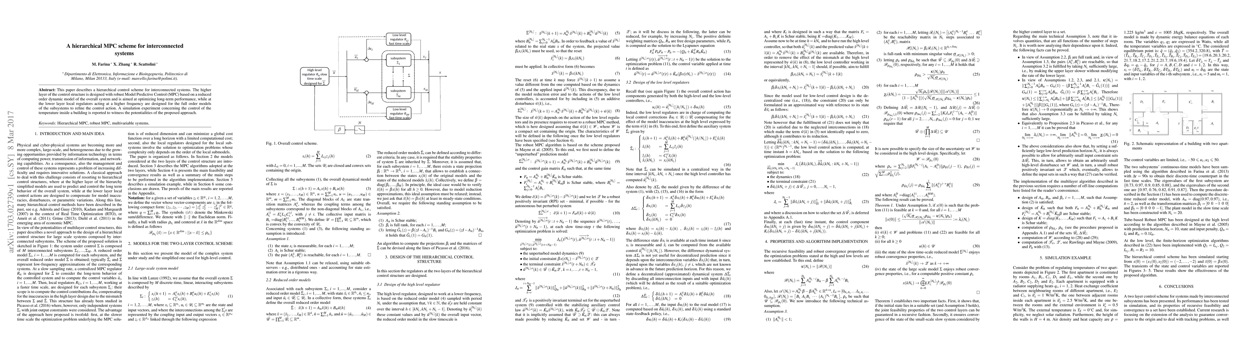 This paper describes a hierarchical control scheme for interconnected systems. The higher layer of the control structure is designed with robust Model Predictive Control (MPC) based on a reduced order dynamic model of the overall system and is aimed at optimizing long-term performance, while at the lower layer local regulators acting at a higher frequency are designed for the full order models of the subsystems to refine the control action. A simulation experiment concerning the control of the temperature inside a building is reported to witness the potentialities of the proposed approach.