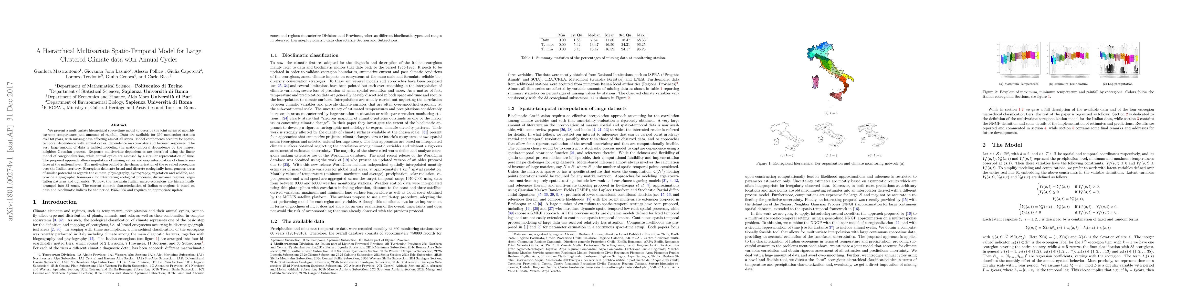 This paper introduces a multivariate hierarchical spatio-temporal model to analyze monthly extreme temperatures and rainfall data from 360 Italian stations over 60 years, addressing missing data and annual cycles. The model facilitates imputation and interpolation for updating the climatic characterization of Italy's ecoregions.