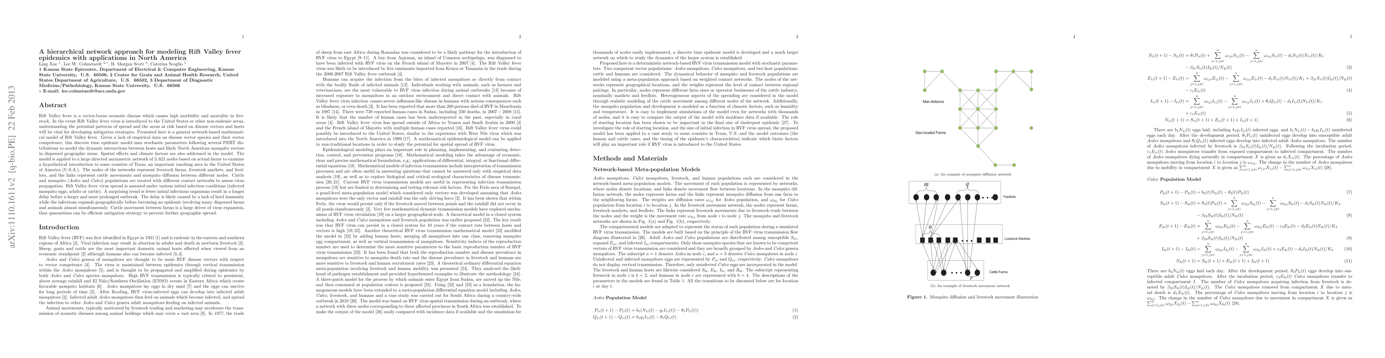 Rift Valley fever is a vector-borne zoonotic disease which causes high morbidity and mortality in livestock. In the event Rift Valley fever virus is introduced to the United States or other non-endemic areas, understanding the potential patterns of spread and the areas at risk based on disease vectors and hosts will be vital for developing mitigation strategies. Presented here is a general network-based mathematical model of Rift Valley fever. Given a lack of empirical data on disease vector species and their vector competence, this discrete time epidemic model uses stochastic parameters following several PERT distributions to model the dynamic interactions between hosts and likely North American mosquito vectors in dispersed geographic areas. Spatial effects and climate factors are also addressed in the model. The model is applied to a large directed asymmetric network of 3,621 nodes based on actual farms to examine a hypothetical introduction to some counties of Texas, an important ranching area in the United States of America (U.S.A.). The nodes of the networks represent livestock farms, livestock markets, and feedlots, and the links represent cattle movements and mosquito diffusion between different nodes. Cattle and mosquito (Aedes and Culex) populations are treated with different contact networks to assess virus propagation. Rift Valley fever virus spread is assessed under various initial infection conditions (infected mosquito eggs, adults or cattle). A surprising trend is fewer initial infectious organisms result in a longer delay before a larger and more prolonged outbreak. The delay is likely caused by a lack of herd immunity while the infections expands geographically before becoming an epidemic involving many dispersed farms and animals almost simultaneously.