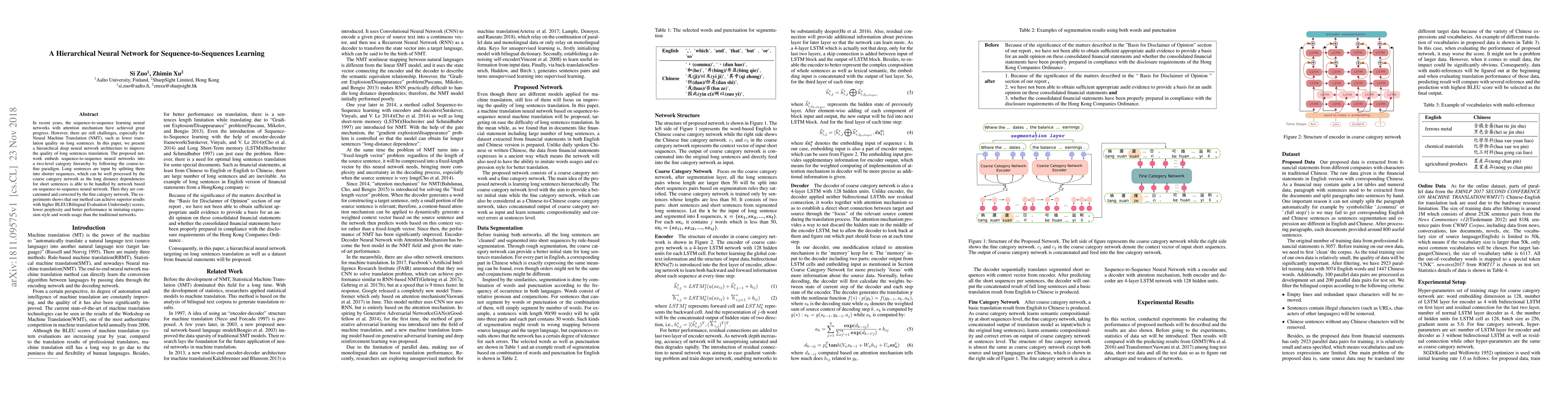 This paper proposes a hierarchical deep neural network architecture that enhances the translation quality of long sentences in Neural Machine Translation by splitting them into shorter sequences processed in a coarse-to-fine manner. Experimental results demonstrate improved BLEU scores and better expression style imitation compared to traditional sequence-to-sequence networks.