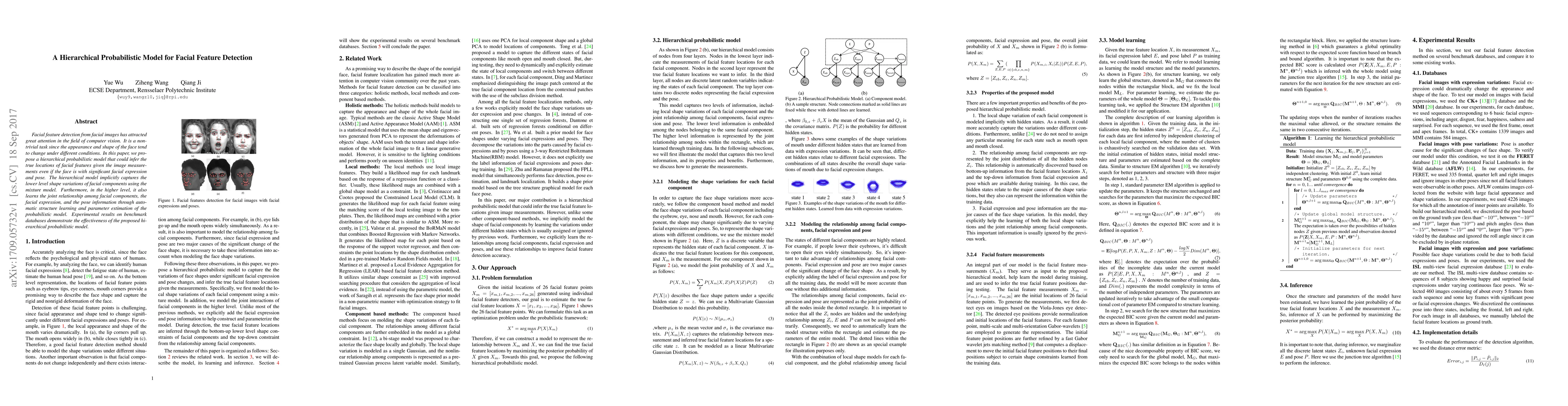 This paper proposes a hierarchical probabilistic model for detecting facial features under varying expressions and poses. The model captures shape variations and learns joint relationships among facial components, expressions, and poses, demonstrating effectiveness on benchmark datasets.
