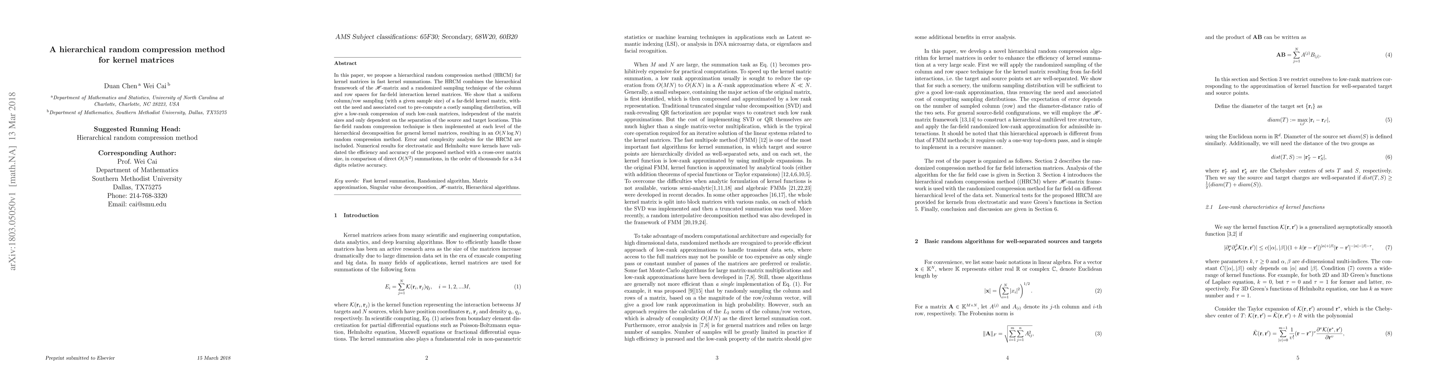 This paper proposes a hierarchical random compression method (HRCM) for fast kernel summations, combining H-matrix hierarchical frameworks with randomized sampling to achieve O(N logN) complexity. The method provides an efficient low-rank compression for large kernel matrices, validated through electrostatic and Helmholtz wave kernels.