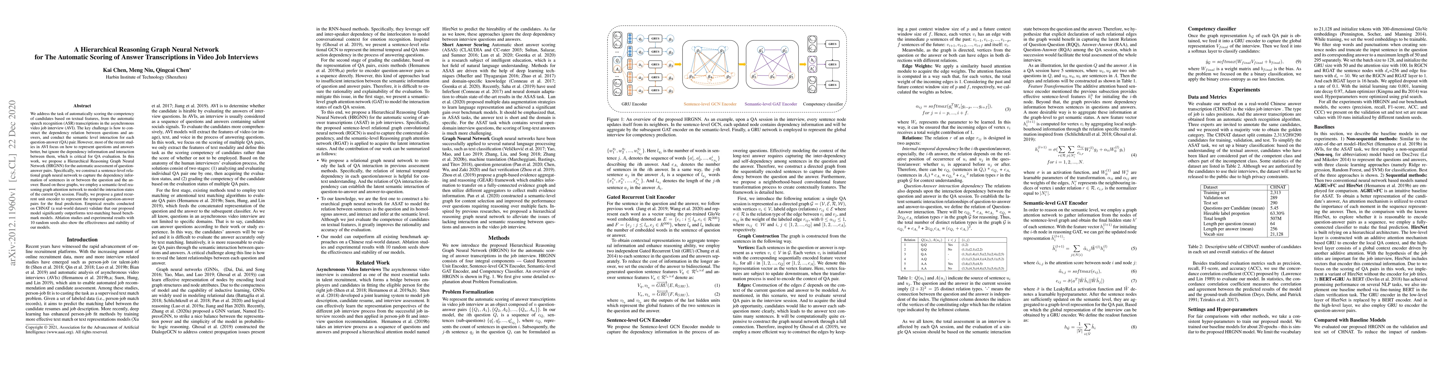 This paper proposes a Hierarchical Reasoning Graph Neural Network (HRGNN) to automatically score competency in video job interviews by analyzing ASR transcriptions. The model captures sentence dependencies and models interactions between question-answer pairs, significantly outperforming text-matching benchmarks on the CHNAT dataset.