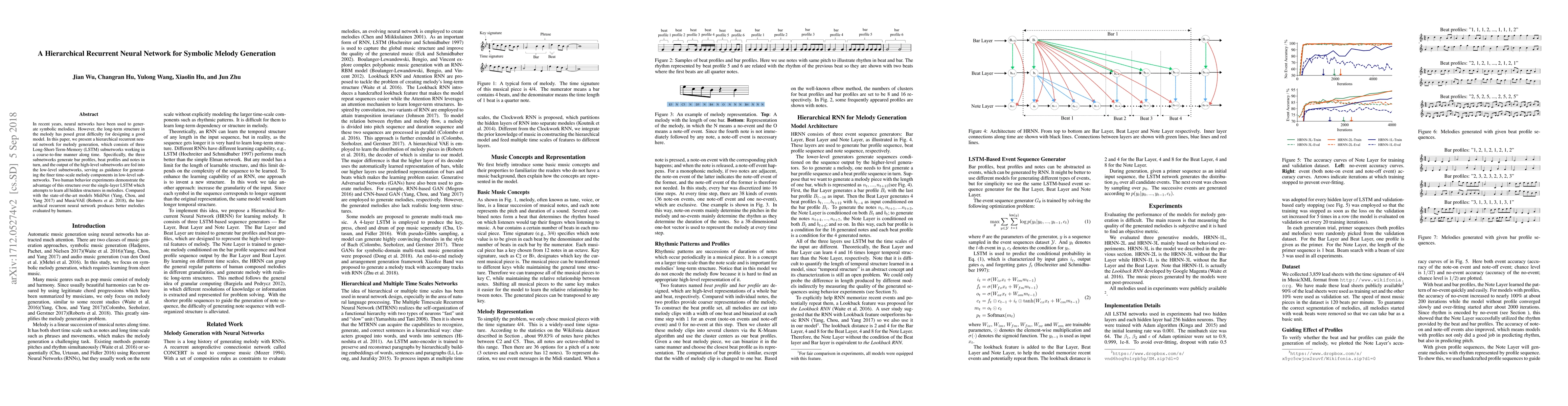 This paper introduces a hierarchical recurrent neural network with three LSTM subnetworks for generating symbolic melodies, addressing long-term structure challenges. The model outperforms single-layer LSTMs and state-of-the-art models MidiNet and MusicVAE in human evaluations.