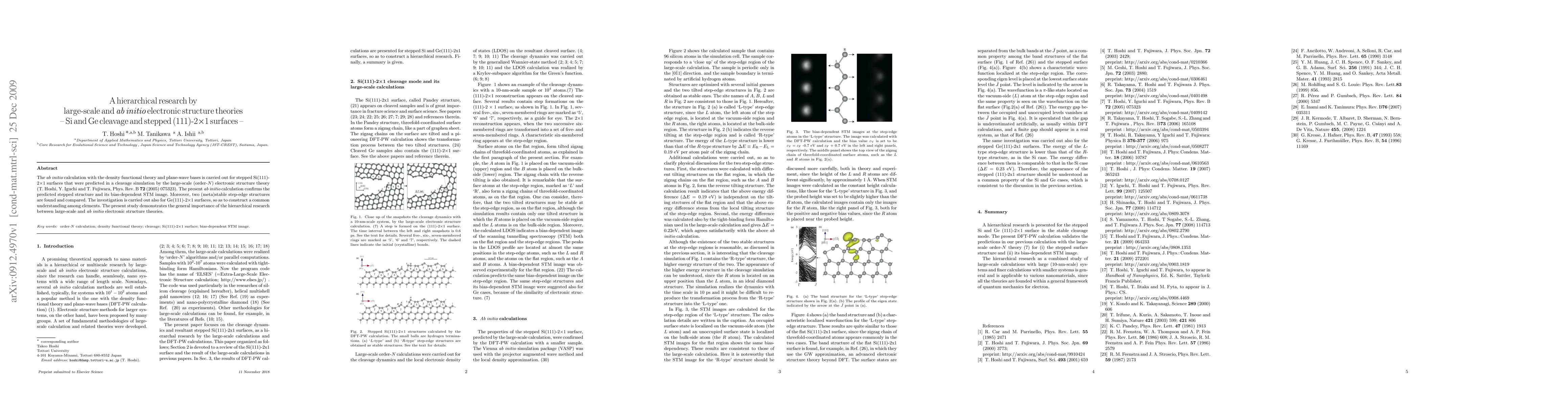 This paper combines large-scale electronic structure theory with ab initio calculations to confirm predicted stepped Si(111)-2x1 surface structures and their STM images. It also identifies two metastable step-edge configurations and extends the study to Ge(111)-2x1 surfaces, highlighting the importance of integrating hierarchical research methods.