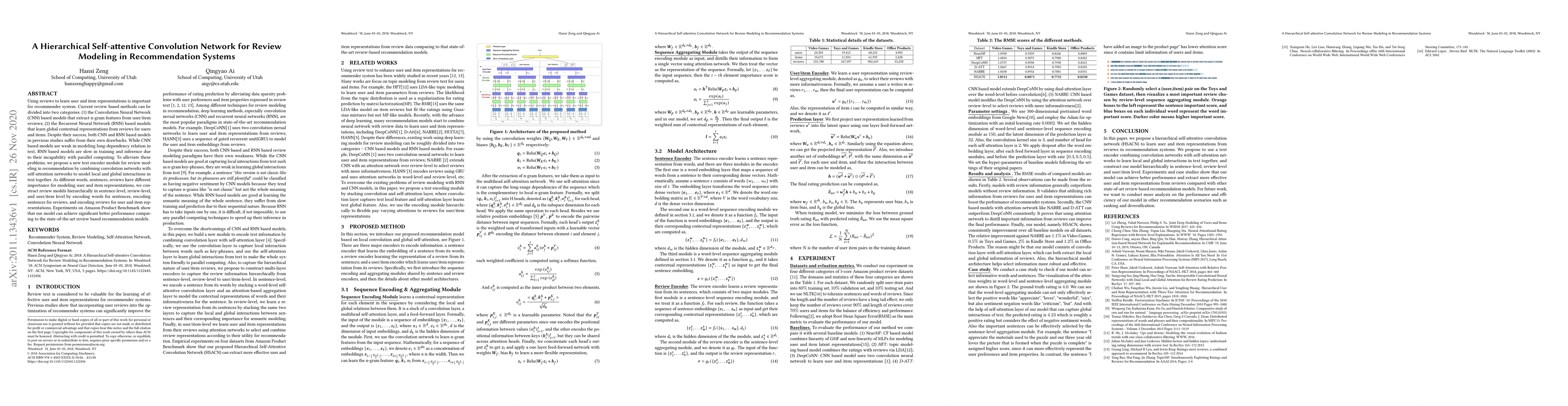 This paper proposes a hierarchical self-attentive convolution network combining CNN and self-attention for review modeling in recommendation systems, addressing the drawbacks of both CNN and RNN models. The hierarchical approach encodes words, sentences, and reviews to capture local and global text interactions, achieving superior performance over state-of-the-art models on Amazon Product Benchmark.