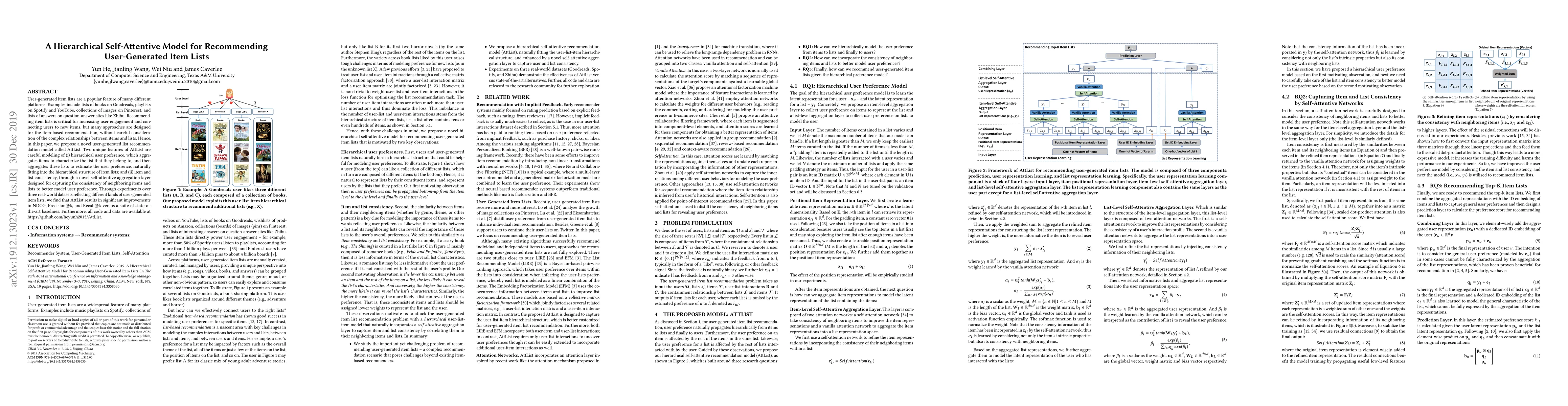 This paper proposes AttList, a hierarchical self-attentive model for recommending user-generated item lists, focusing on modeling hierarchical user preferences and item/list consistency. Experimental results show significant improvements over state-of-the-art baselines in various metrics.