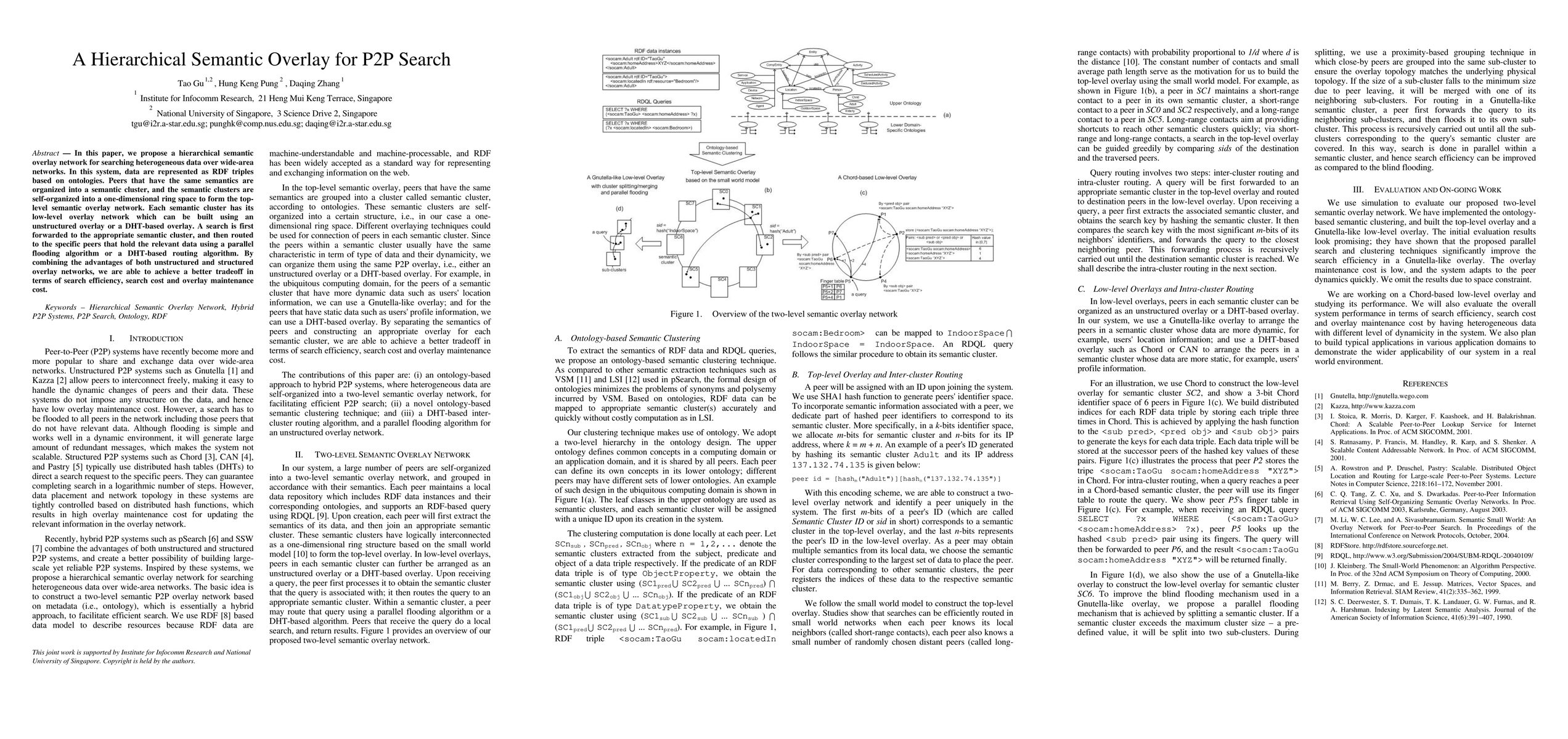 This paper introduces a hierarchical semantic overlay network for efficient P2P search across heterogeneous data. It organizes peers into semantic clusters and overlays them into a ring structure, combining unstructured and DHT-based networks to optimize search efficiency and cost.