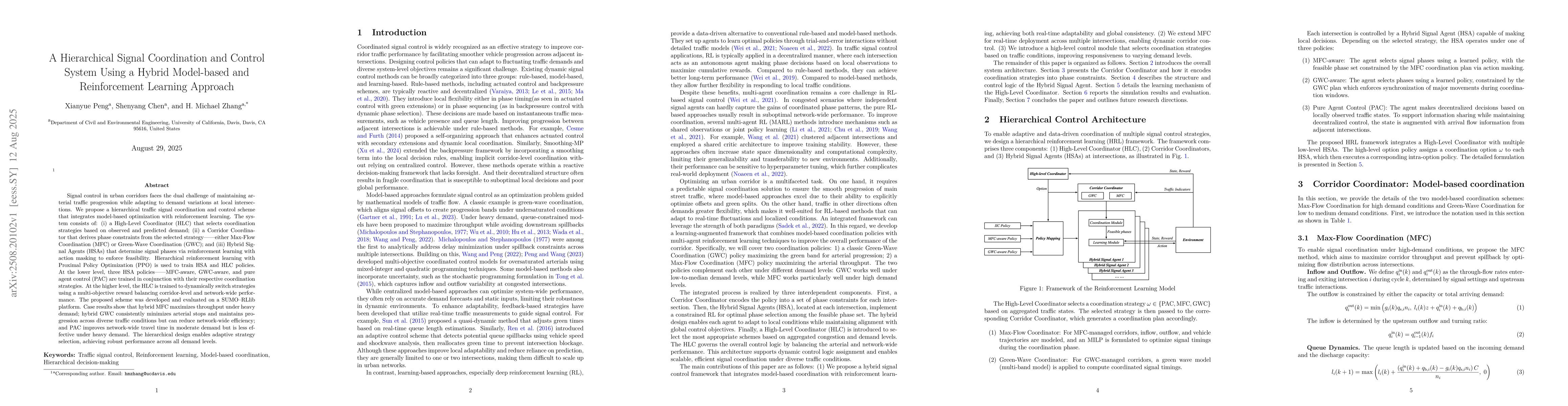 Signal control in urban corridors faces the dual challenge of maintaining arterial traffic progression while adapting to demand variations at local intersections. We propose a hierarchical traffic signal coordination and control scheme that integrates model-based optimization with reinforcement learning. The system consists of: (i) a High-Level Coordinator (HLC) that selects coordination strategies based on observed and predicted demand; (ii) a Corridor Coordinator that derives phase constraints from the selected strategy-either Max-Flow Coordination (MFC) or Green-Wave Coordination (GWC); and (iii) Hybrid Signal Agents (HSAs) that determine signal phases via reinforcement learning with action masking to enforce feasibility. Hierarchical reinforcement learning with Proximal Policy Optimization (PPO) is used to train HSA and HLC policies. At the lower level, three HSA policies-MFC-aware, GWC-aware, and pure agent control (PAC) are trained in conjunction with their respective coordination strategies. At the higher level, the HLC is trained to dynamically switch strategies using a multi-objective reward balancing corridor-level and network-wide performance. The proposed scheme was developed and evaluated on a SUMO-RLlib platform. Case results show that hybrid MFC maximizes throughput under heavy demand; hybrid GWC consistently minimizes arterial stops and maintains progression across diverse traffic conditions but can reduce network-wide efficiency; and PAC improves network-wide travel time in moderate demand but is less effective under heavy demand. The hierarchical design enables adaptive strategy selection, achieving robust performance across all demand levels.