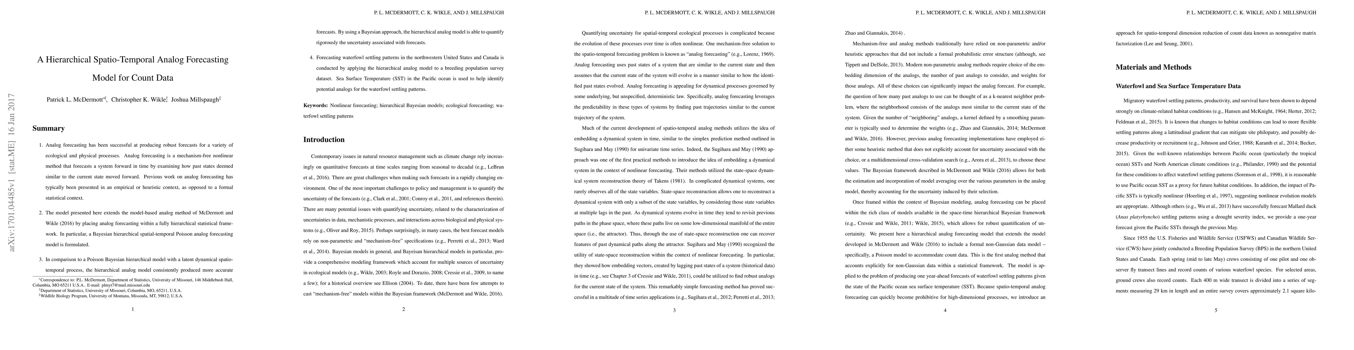 1. Analog forecasting has been successful at producing robust forecasts for a variety of ecological and physical processes. Analog forecasting is a mechanism-free nonlinear method that forecasts a system forward in time by examining how past states deemed similar to the current state moved forward. Previous work on analog forecasting has typically been presented in an empirical or heuristic context, as opposed to a formal statistical context. 2. The model presented here extends the model-based analog method of McDermott and Wikle (2016) by placing analog forecasting within a fully hierarchical statistical frame- work. In particular, a Bayesian hierarchical spatial-temporal Poisson analog forecasting model is formulated. 3. In comparison to a Poisson Bayesian hierarchical model with a latent dynamical spatio- temporal process, the hierarchical analog model consistently produced more accurate forecasts. By using a Bayesian approach, the hierarchical analog model is able to quantify rigorously the uncertainty associated with forecasts. 4. Forecasting waterfowl settling patterns in the northwestern United States and Canada is conducted by applying the hierarchical analog model to a breeding population survey dataset. Sea Surface Temperature (SST) in the Pacific ocean is used to help identify potential analogs for the waterfowl settling patterns.