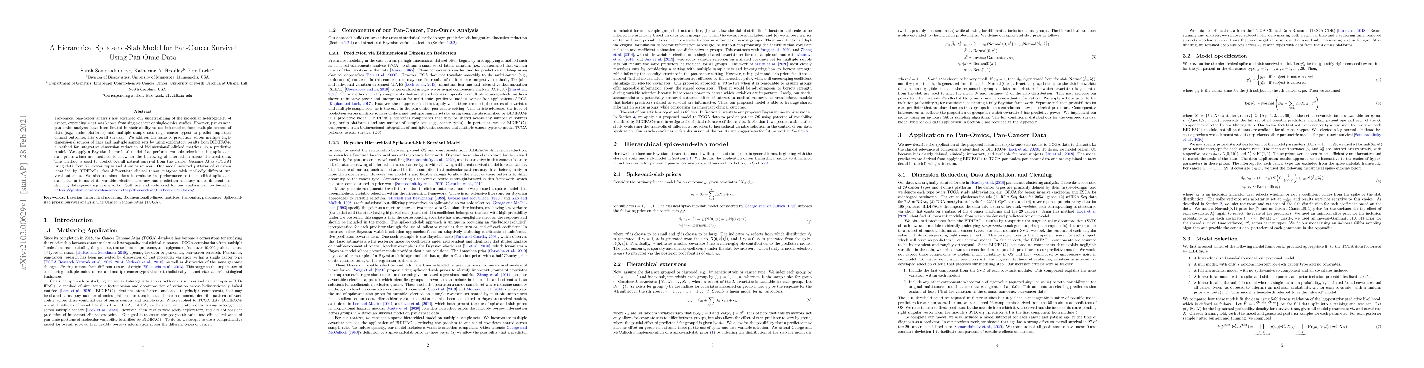 This paper proposes a hierarchical spike-and-slab model to predict overall survival in pan-cancer patients using integrative pan-omic data from multiple cancer types. The model leverages BIDIFAC+ for dimensionality reduction and modified spike-and-slab priors for variable selection across clustered data, demonstrating improved prediction accuracy and variable selection performance through simulations.