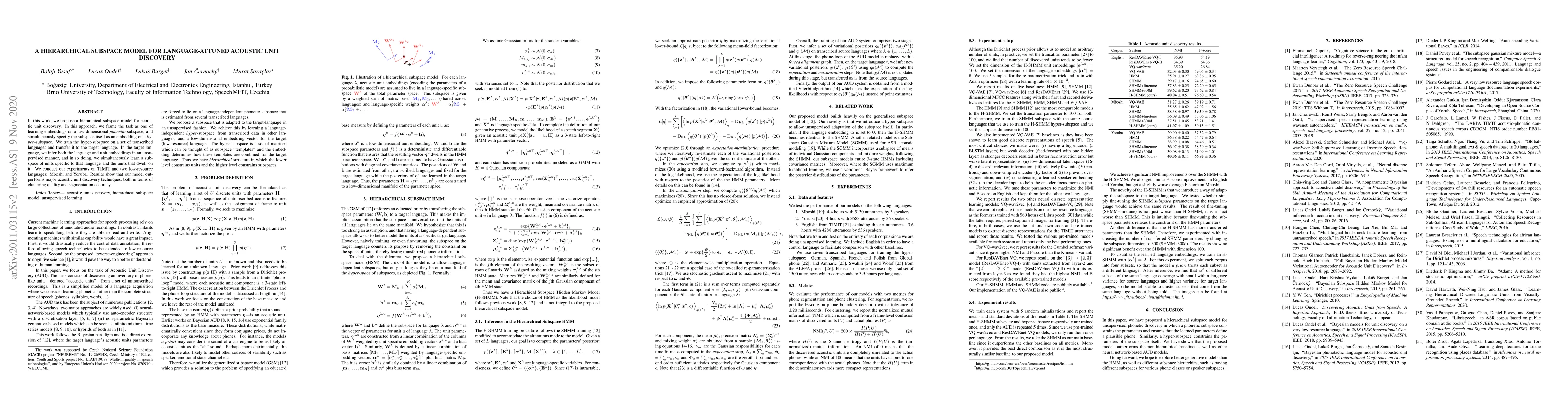 This paper introduces a hierarchical subspace model for discovering language-specific acoustic units, achieving superior clustering and segmentation accuracy over existing methods on TIMIT, Mboshi, and Yoruba datasets. The model learns embeddings on a phonetic subspace and transfers it to target languages for unsupervised inference.
