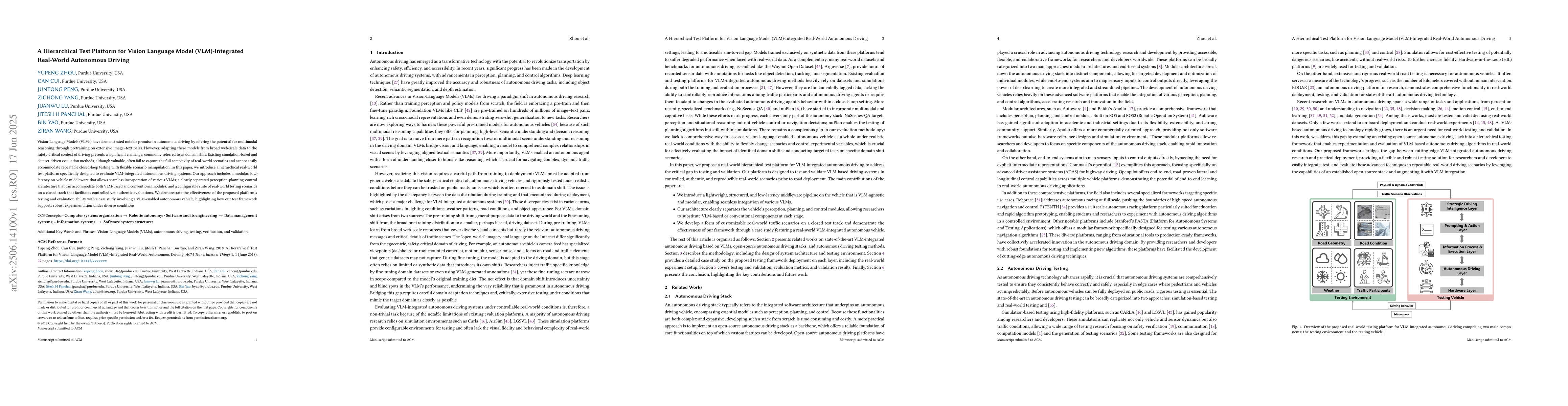 Vision-Language Models (VLMs) have demonstrated notable promise in autonomous driving by offering the potential for multimodal reasoning through pretraining on extensive image-text pairs. However, adapting these models from broad web-scale data to the safety-critical context of driving presents a significant challenge, commonly referred to as domain shift. Existing simulation-based and dataset-driven evaluation methods, although valuable, often fail to capture the full complexity of real-world scenarios and cannot easily accommodate repeatable closed-loop testing with flexible scenario manipulation. In this paper, we introduce a hierarchical real-world test platform specifically designed to evaluate VLM-integrated autonomous driving systems. Our approach includes a modular, low-latency on-vehicle middleware that allows seamless incorporation of various VLMs, a clearly separated perception-planning-control architecture that can accommodate both VLM-based and conventional modules, and a configurable suite of real-world testing scenarios on a closed track that facilitates controlled yet authentic evaluations. We demonstrate the effectiveness of the proposed platform`s testing and evaluation ability with a case study involving a VLM-enabled autonomous vehicle, highlighting how our test framework supports robust experimentation under diverse conditions.