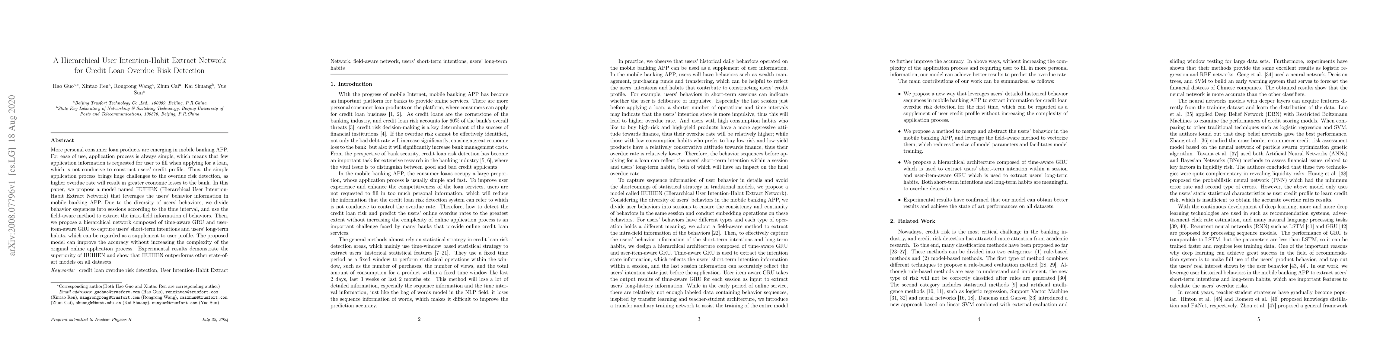 More personal consumer loan products are emerging in mobile banking APP. For ease of use, application process is always simple, which means that few application information is requested for user to fill when applying for a loan, which is not conducive to construct users' credit profile. Thus, the simple application process brings huge challenges to the overdue risk detection, as higher overdue rate will result in greater economic losses to the bank. In this paper, we propose a model named HUIHEN (Hierarchical User Intention-Habit Extract Network) that leverages the users' behavior information in mobile banking APP. Due to the diversity of users' behaviors, we divide behavior sequences into sessions according to the time interval, and use the field-aware method to extract the intra-field information of behaviors. Then, we propose a hierarchical network composed of time-aware GRU and user-item-aware GRU to capture users' short-term intentions and users' long-term habits, which can be regarded as a supplement to user profile. The proposed model can improve the accuracy without increasing the complexity of the original online application process. Experimental results demonstrate the superiority of HUIHEN and show that HUIHEN outperforms other state-of-art models on all datasets.