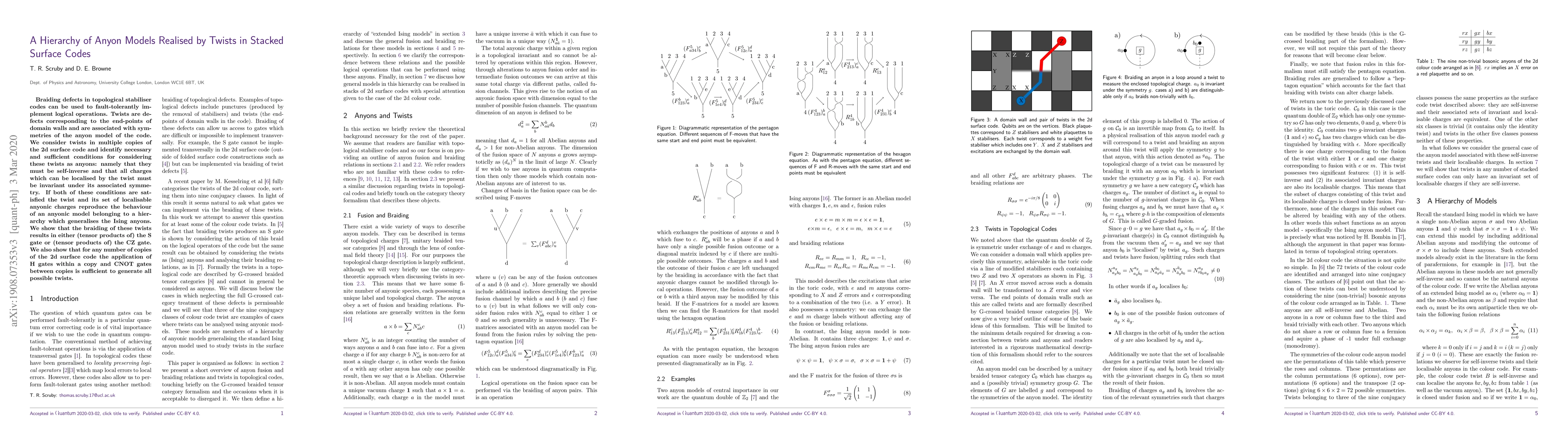 This paper explores how twists in stacked surface codes can implement anyon models, identifying conditions for these twists to behave as anyons. It demonstrates that these anyons can reproduce a hierarchy of models, including generalizations of Ising anyons, and can be generated through H gates and CNOT gates.