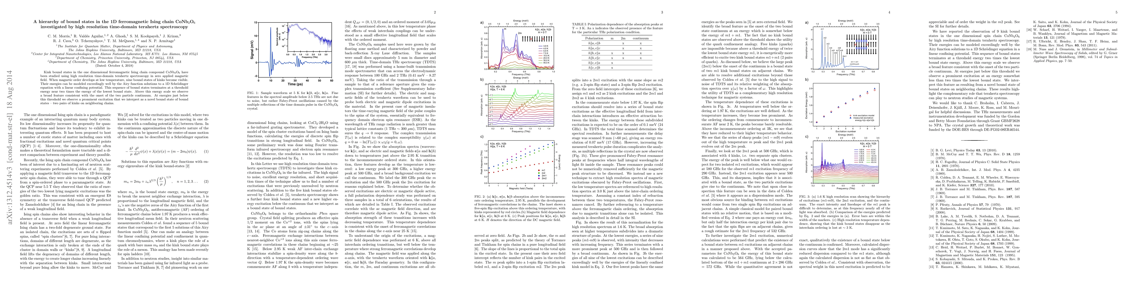 Kink bound states in the one dimensional ferromagnetic Ising chain compound CoNb$_2$O$_6$ have been studied using high resolution time-domain terahertz spectroscopy in zero applied magnetic field. When magnetic order develops at low temperature, nine bound states of kinks become visible. Their energies can be modeled exceedingly well by the Airy function solutions to a 1D Schr\"odinger equation with a linear confining potential. This sequence of bound states terminates at a threshold energy near two times the energy of the lowest bound state. Above this energy scale we observe a broad feature consistent with the onset of the two particle continuum. At energies just below this threshold we observe a prominent excitation that we interpret as a novel bound state of bound states -- two pairs of kinks on neighboring chains.