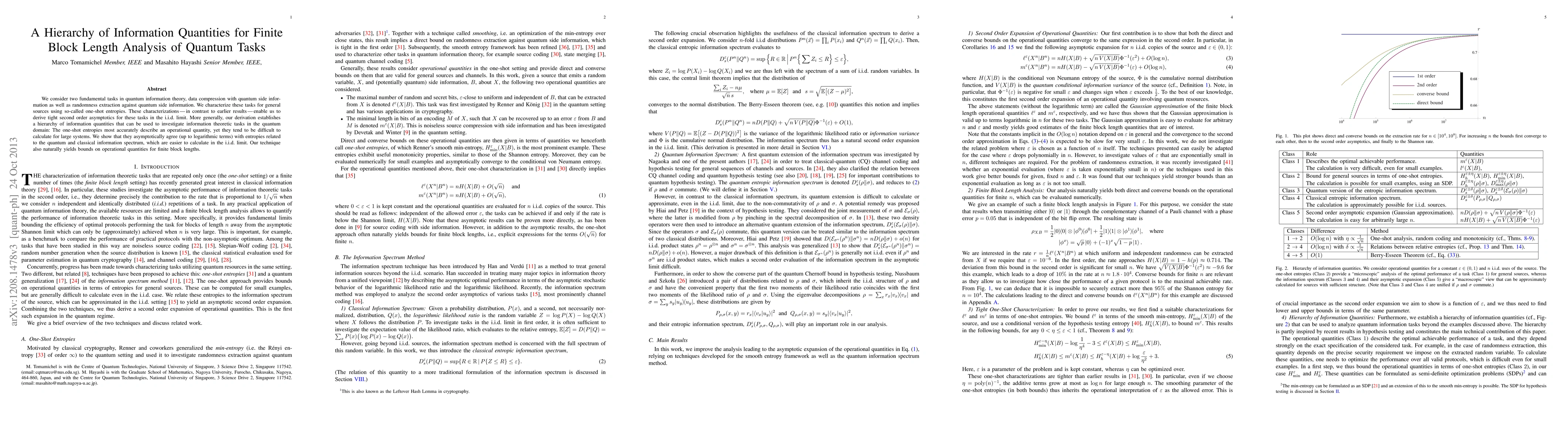 This paper develops a hierarchy of information quantities for analyzing quantum information tasks, showing that one-shot entropies provide the most accurate descriptions but are hard to compute. It demonstrates that these entropies converge to more tractable quantum and classical information measures in the large system limit, enabling better understanding and tighter bounds for quantum data compression and randomness extraction.