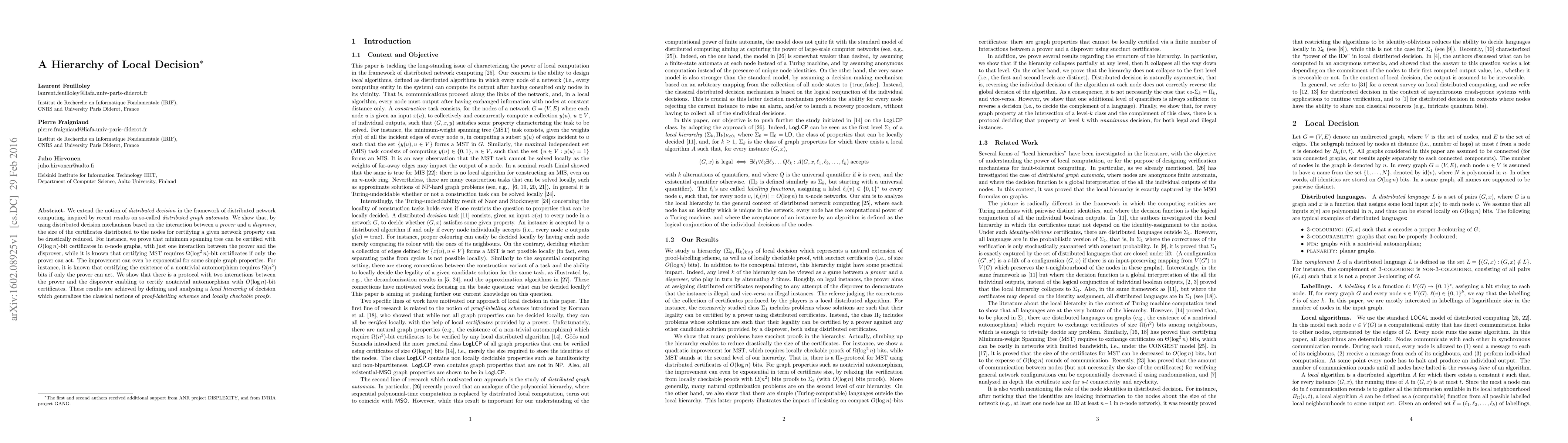 We extend the notion of distributed decision in the framework of distributed network computing, inspired by recent results on so-called distributed graph automata. We show that, by using distributed decision mechanisms based on the interaction between a prover and a disprover, the size of the certificates distributed to the nodes for certifying a given network property can be drastically reduced. For instance, we prove that minimum spanning tree can be certified with $O(\log n)$-bit certificates in $n$-node graphs, with just one interaction between the prover and the disprover, while it is known that certifying MST requires $\Omega(\log^2 n)$-bit certificates if only the prover can act. The improvement can even be exponential for some simple graph properties. For instance, it is known that certifying the existence of a nontrivial automorphism requires $\Omega(n^2)$ bits if only the prover can act. We show that there is a protocol with two interactions between the prover and the disprover enabling to certify nontrivial automorphism with $O(\log n)$-bit certificates. These results are achieved by defining and analysing a local hierarchy of decision which generalizes the classical notions of proof-labelling schemes and locally checkable proofs.