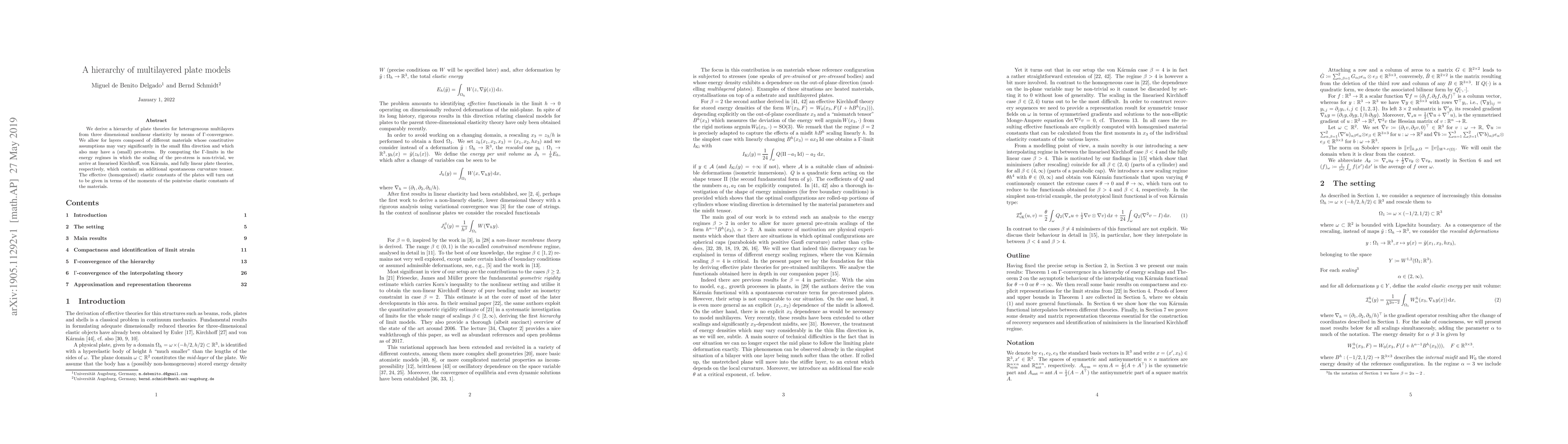 This research derives a hierarchy of plate theories for multilayered materials with varying properties using u03c3-convergence from 3D nonlinear elasticity. It results in linearized Kirchhoff, von Kármán, and fully linear plate theories, incorporating spontaneous curvature tensors. The effective elastic constants are moments of the pointwise constants of the layer materials.