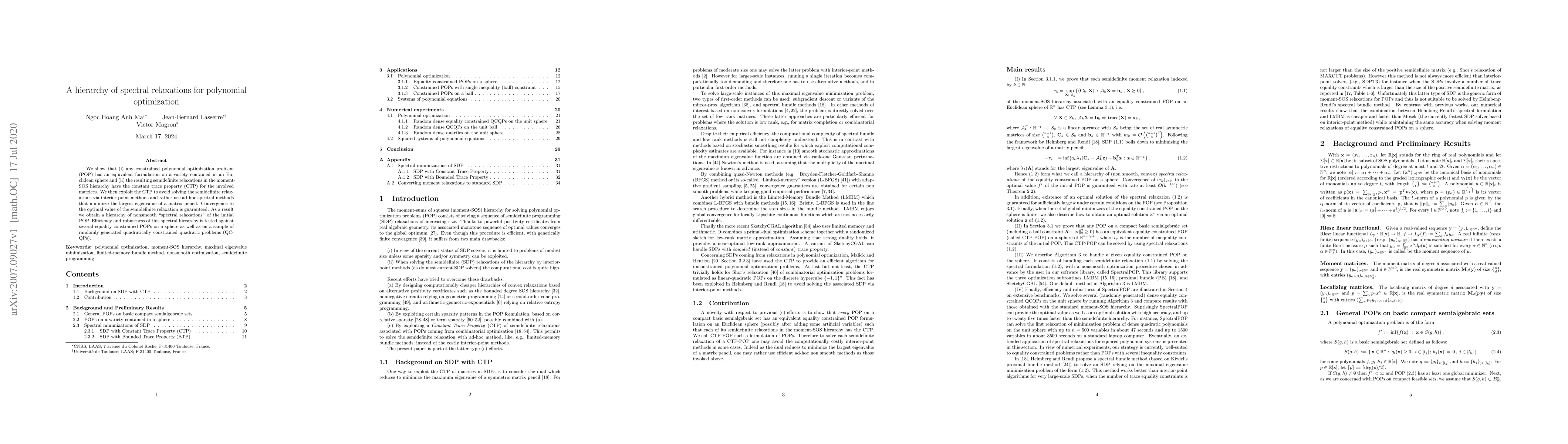 We show that (i) any constrained polynomial optimization problem (POP) has an equivalent formulation on a variety contained in an Euclidean sphere and (ii) the resulting semidefinite relaxations in the moment-SOS hierarchy have the constant trace property (CTP) for the involved matrices. We then exploit the CTP to avoid solving the semidefinite relaxations via interior-point methods and rather use ad-hoc spectral methods that minimize the largest eigenvalue of a matrix pencil. Convergence to the optimal value of the semidefinite relaxation is guaranteed. As a result we obtain a hierarchy of nonsmooth "spectral relaxations" of the initial POP. Efficiency and robustness of this spectral hierarchy is tested against several equality constrained POPs on a sphere as well as on a sample of randomly generated quadratically constrained quadratic problems (QCQPs).