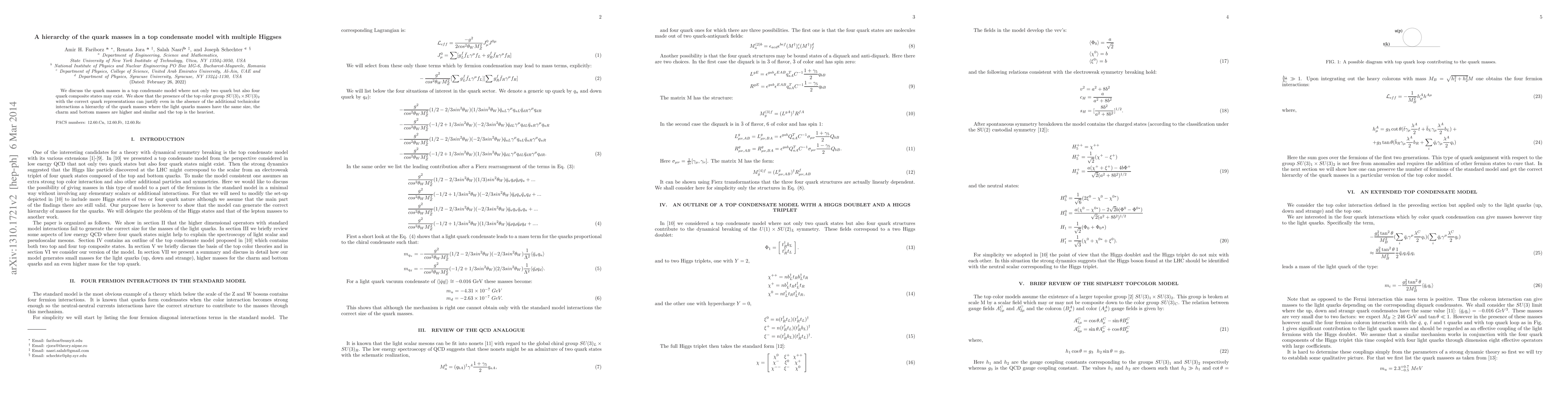 This paper proposes a top condensate model with multiple Higgses, demonstrating that with the correct quark representations under the top color group SU(3)_1×SU(3)_2, a natural hierarchy of quark masses can emerge. Light quarks are predicted to have similar masses, charm and bottom masses to be higher and comparable, while the top quark remains the heaviest, all without requiring additional technicolor interactions.