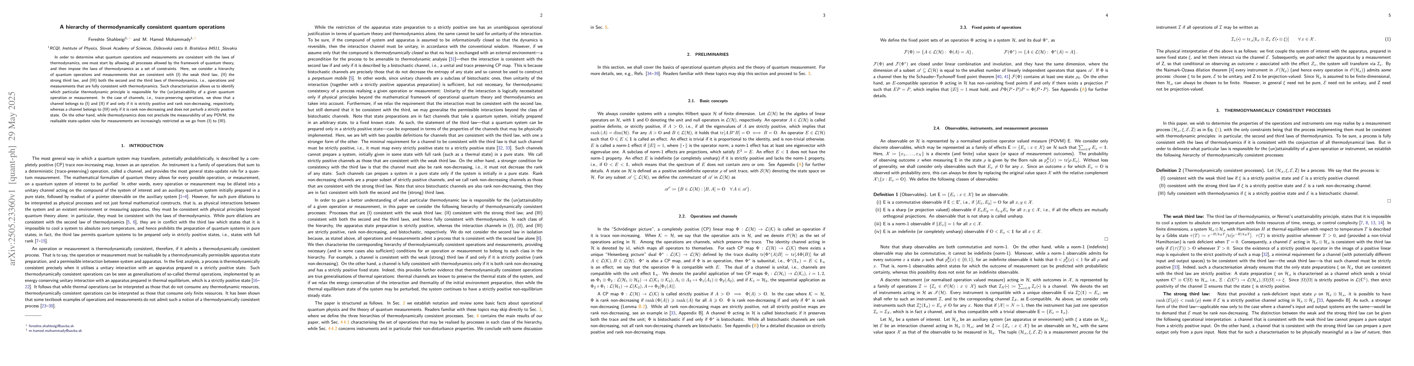 The paper introduces a hierarchical classification of quantum operations based on thermodynamic consistency, providing necessary and sufficient conditions for membership in each class.
