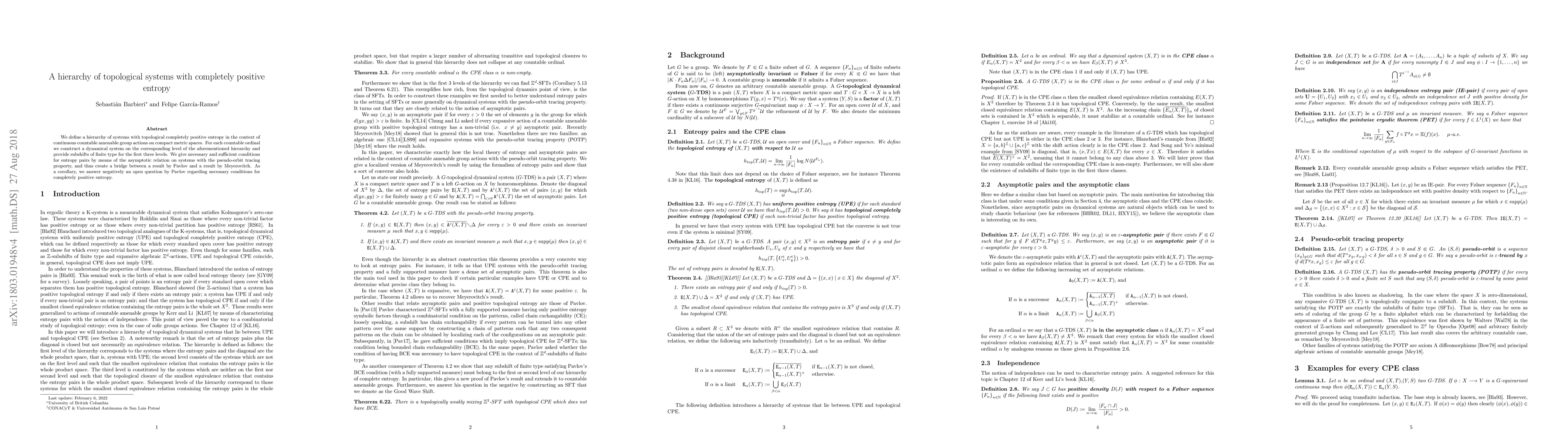 We define a hierarchy of systems with topological completely positive entropy in the context of continuous countable amenable group actions on compact metric spaces. For each countable ordinal we construct a dynamical system on the corresponding level of the aforementioned hierarchy and provide subshifts of finite type for the first three levels. We give necessary and sufficient conditions for entropy pairs by means of the asymptotic relation on systems with the pseudo-orbit tracing property, and thus create a bridge between a result by Pavlov and a result by Meyerovitch. As a corollary, we answer negatively an open question by Pavlov regarding necessary conditions for completely positive entropy.