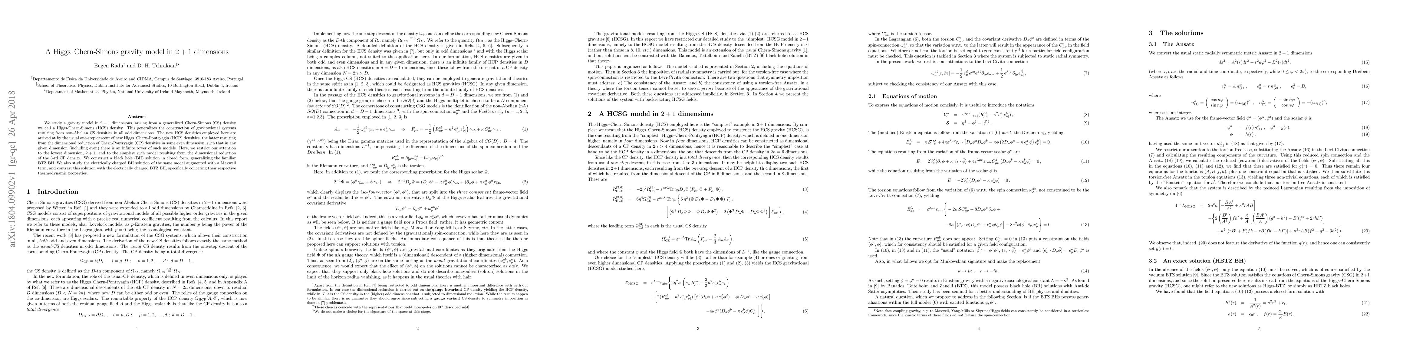 This paper studies a gravity model in 2+1 dimensions based on a generalized Higgs-Chern-Simons density, deriving it from dimensional reduction of Chern-Pontryagin densities. It constructs a black hole solution analogous to the BTZ black hole and examines its electrically charged counterpart, comparing thermodynamic properties with those of the charged BTZ black hole.