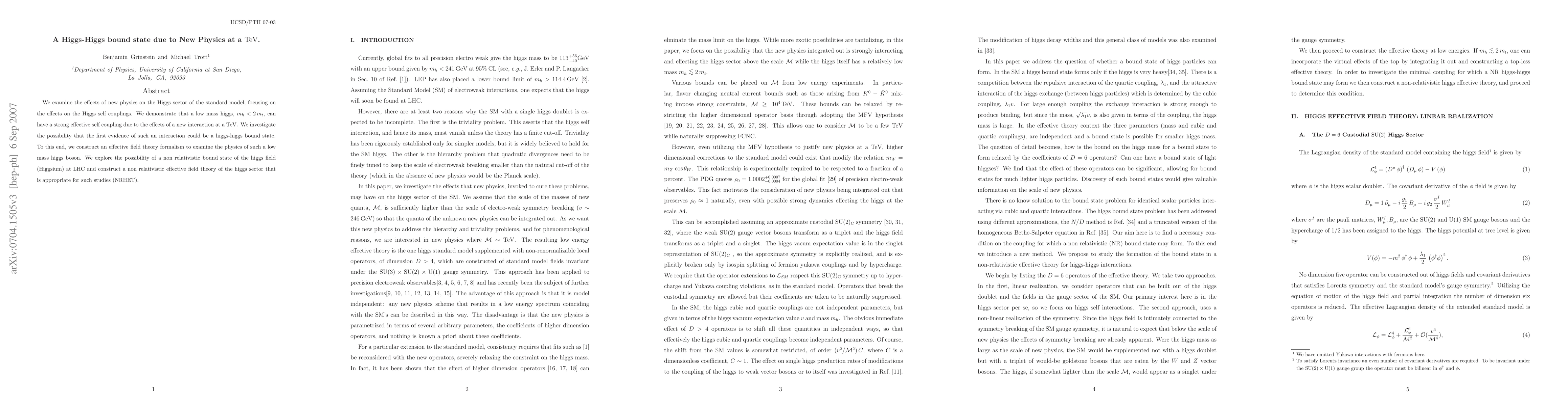We examine the effects of new physics effecting the Higgs sector of the standard model, focusing on the effects on the Higgs self couplings. We demonstrate that a low mass higgs, m_h < 2 m_t, can have a strong effective self coupling due to the effects of a new interaction at a TeV. We investigate the possibility that the first evidence of such an interaction could be a higgs-higgs bound state. To this end, we construct an effective field theory formalism to examine the physics of such a low mass higgs boson. We explore the possibility of a non relativistic bound state of the higgs field (Higgsium) at LHC and construct a non relativistic effective field theory of the higgs sector that is appropriate for such studies (NRHET).