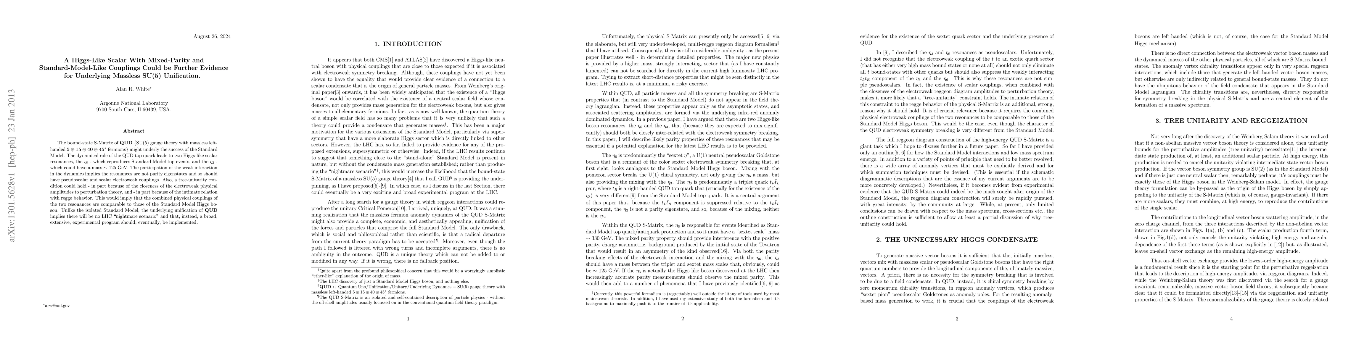 The bound-state S-Matrix of QUD (SU(5) gauge theory with massless left-handed 5 + 15 + 40 + 45* fermions) might underly the success of the Standard Model. The dynamical role of the QUD top quark leads to two Higgs-like scalar resonances, the eta_6 - which reproduces Standard Model top events, and the eta_3 - which could have a mass ~ 125 GeV. The participation of the weak interaction in the dynamics implies the resonances are not parity eigenstates and so should have pseudoscalar and scalar electroweak couplings. Also, a tree-unitarity condition could hold - in part because of the closeness of the electroweak physical amplitudes to perturbation theory, and - in part because of the intimate relation with regge behavior. This would imply that the combined physical couplings of the two resonances are comparable to those of the Standard Model Higgs boson. Unlike the isolated Standard Model, the underlying unification of QUD implies there will be no LHC "nightmare scenario" and that, instead, a broad, extensive, experimental program should, eventually, be implemented.