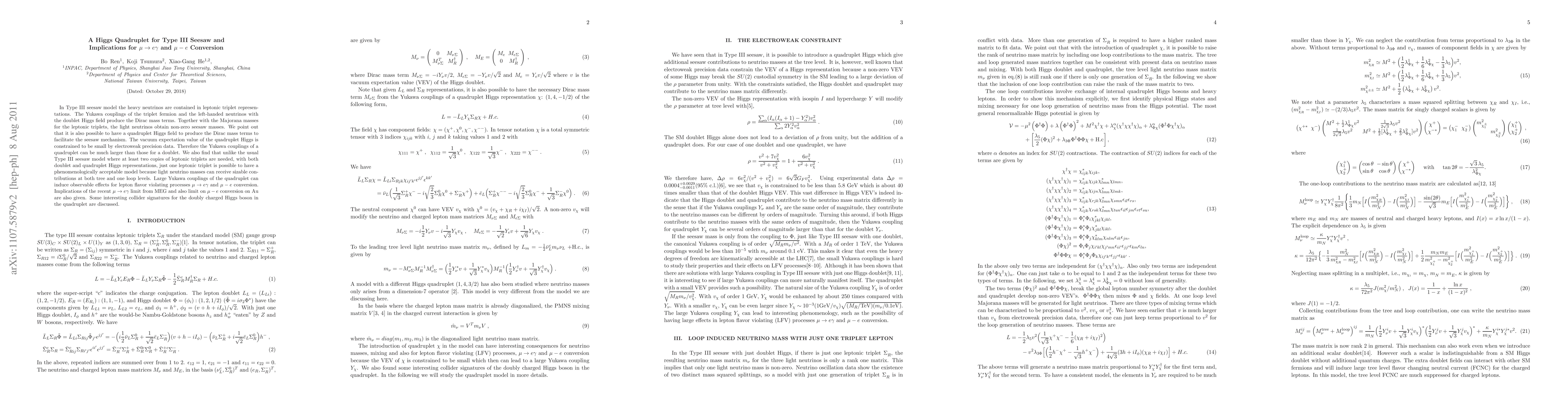 In Type III seesaw model the heavy neutrinos are contained in leptonic triplet representations. The Yukawa couplings of the triplet fermion and the left-handed neutrinos with the doublet Higgs field produce the Dirac mass terms. Together with the Majorana masses for the leptonic triplets, the light neutrinos obtain non-zero seesaw masses. We point out that it is also possible to have a quadruplet Higgs field to produce the Dirac mass terms to facilitate the seesaw mechanism. The vacuum expectation value of the quadruplet Higgs is constrained to be small by electroweak precision data. Therefore the Yukawa couplings of a quadruplet can be much larger than those for a doublet. We also find that unlike the usual Type III seesaw model where at least two copies of leptonic triplets are needed, with both doublet and quadruplet Higgs representations, just one leptonic triplet is possible to have a phenomenologically acceptable model because light neutrino masses can receive sizable contributions at both tree and one loop levels. Large Yukawa couplings of the quadruplet can induce observable effects for lepton flavor violating processes $\mu \to e \gamma$ and $\mu - e$ conversion. Implications of the recent $\mu \to e\gamma$ limit from MEG and also limit on $\mu - e $ conversion on Au are also given. Some interesting collider signatures for the doubly charged Higgs boson in the quadruplet are discussed.