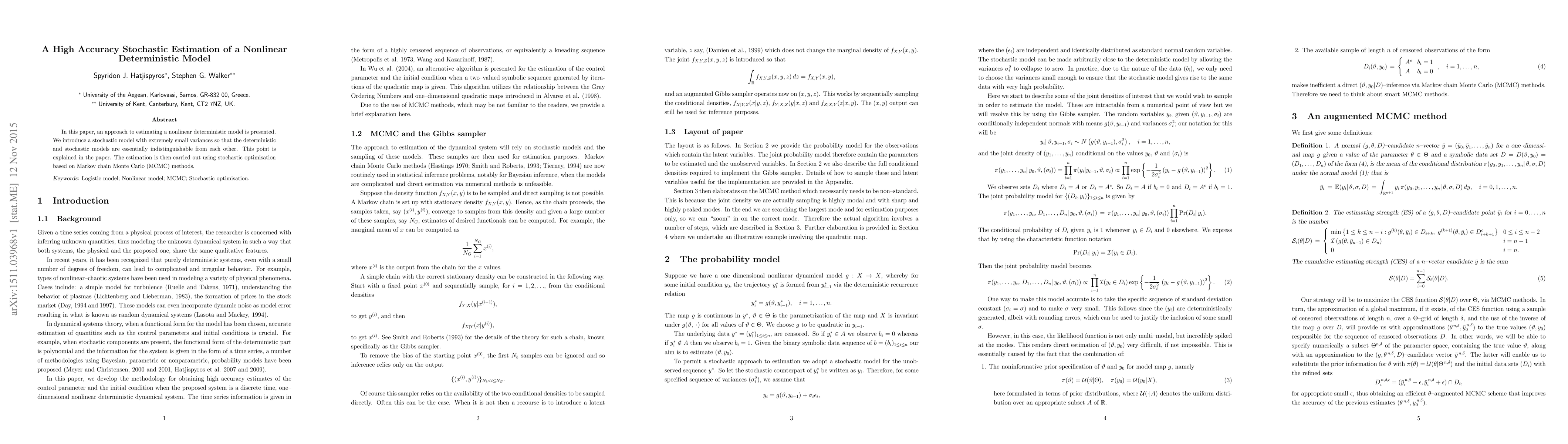 In this paper, an approach to estimating a nonlinear deterministic model is presented. We introduce a stochastic model with extremely small variances so that the deterministic and stochastic models are essentially indistinguishable from each other. This point is explained in the paper. The estimation is then carried out using stochastic optimisation based on Markov chain Monte Carlo (MCMC) methods.