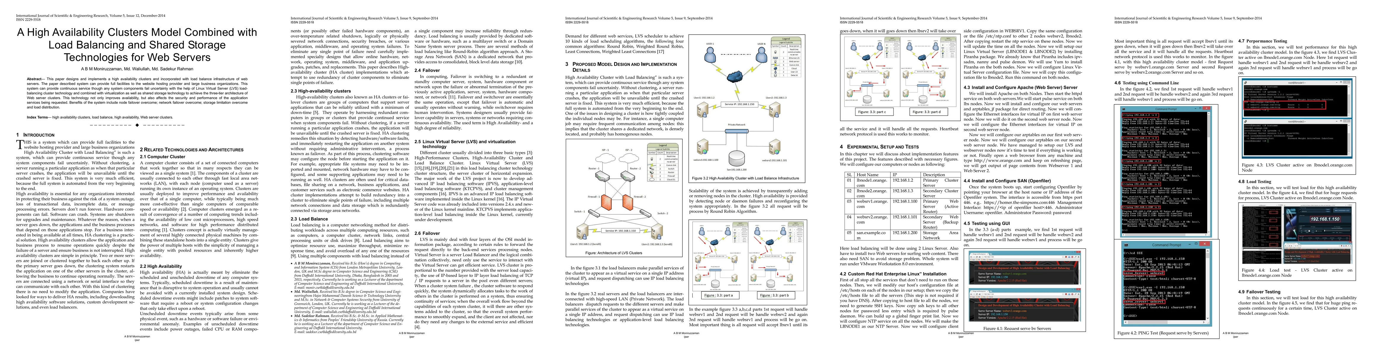 This paper presents a high availability web server cluster model using load balancing and shared storage technologies, ensuring continuous service despite component failures through Linux Virtual Server (LVS) and virtualization. The system enhances availability, security, and performance while overcoming node, network, and storage limitations.