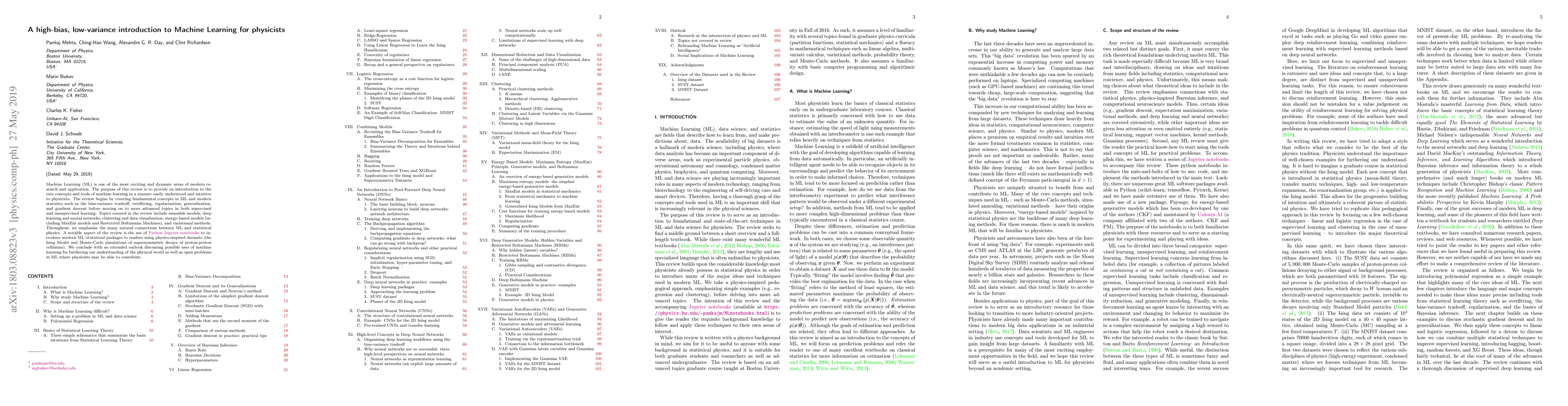 Machine Learning (ML) is one of the most exciting and dynamic areas of modern research and application. The purpose of this review is to provide an introduction to the core concepts and tools of machine learning in a manner easily understood and intuitive to physicists. The review begins by covering fundamental concepts in ML and modern statistics such as the bias-variance tradeoff, overfitting, regularization, generalization, and gradient descent before moving on to more advanced topics in both supervised and unsupervised learning. Topics covered in the review include ensemble models, deep learning and neural networks, clustering and data visualization, energy-based models (including MaxEnt models and Restricted Boltzmann Machines), and variational methods. Throughout, we emphasize the many natural connections between ML and statistical physics. A notable aspect of the review is the use of Python Jupyter notebooks to introduce modern ML/statistical packages to readers using physics-inspired datasets (the Ising Model and Monte-Carlo simulations of supersymmetric decays of proton-proton collisions). We conclude with an extended outlook discussing possible uses of machine learning for furthering our understanding of the physical world as well as open problems in ML where physicists may be able to contribute. (Notebooks are available at https://physics.bu.edu/~pankajm/MLnotebooks.html )
