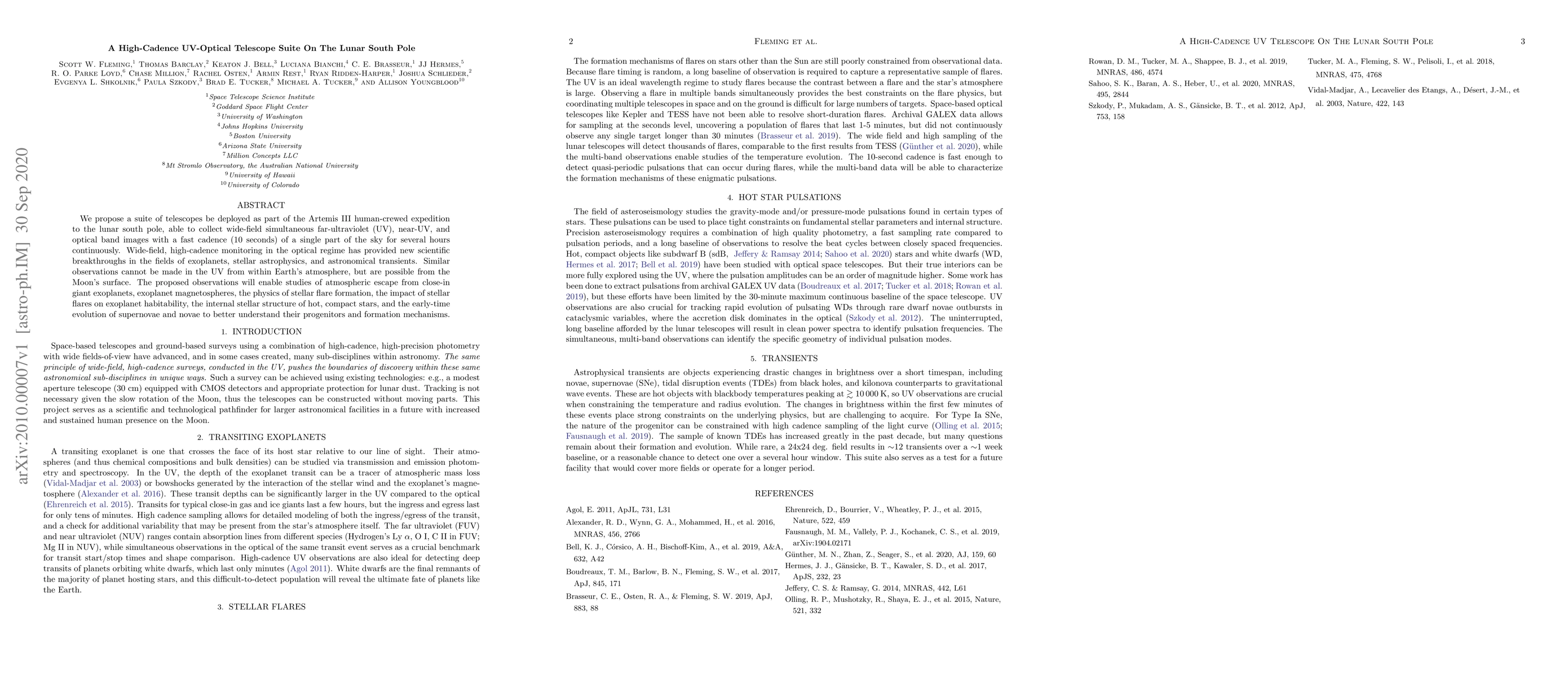 This paper proposes deploying a high-cadence UV-optical telescope suite on the lunar south pole during Artemis III to capture simultaneous far-UV, near-UV, and optical images. The aim is to study exoplanet atmospheres, stellar flares, and supernovae, leveraging the Moon's unique vantage point outside Earth's atmosphere.