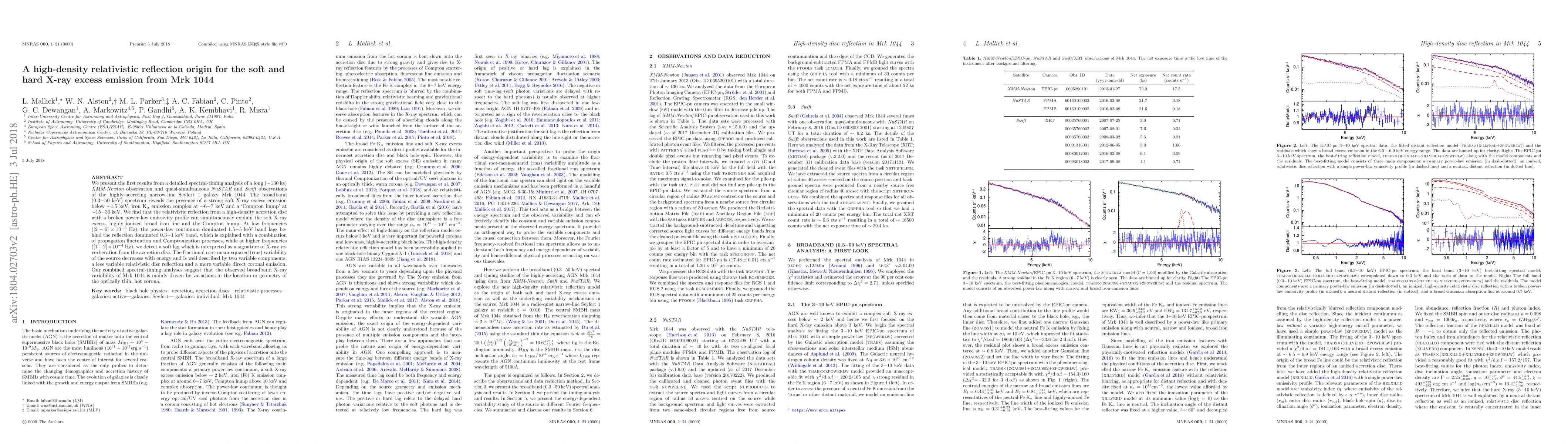The study of the X-ray emitting galaxy Mrk 1044 reveals a high-density relativistic reflection origin for its soft and hard X-ray excess emission, with variations in accretion disc geometry driving broadband variability.