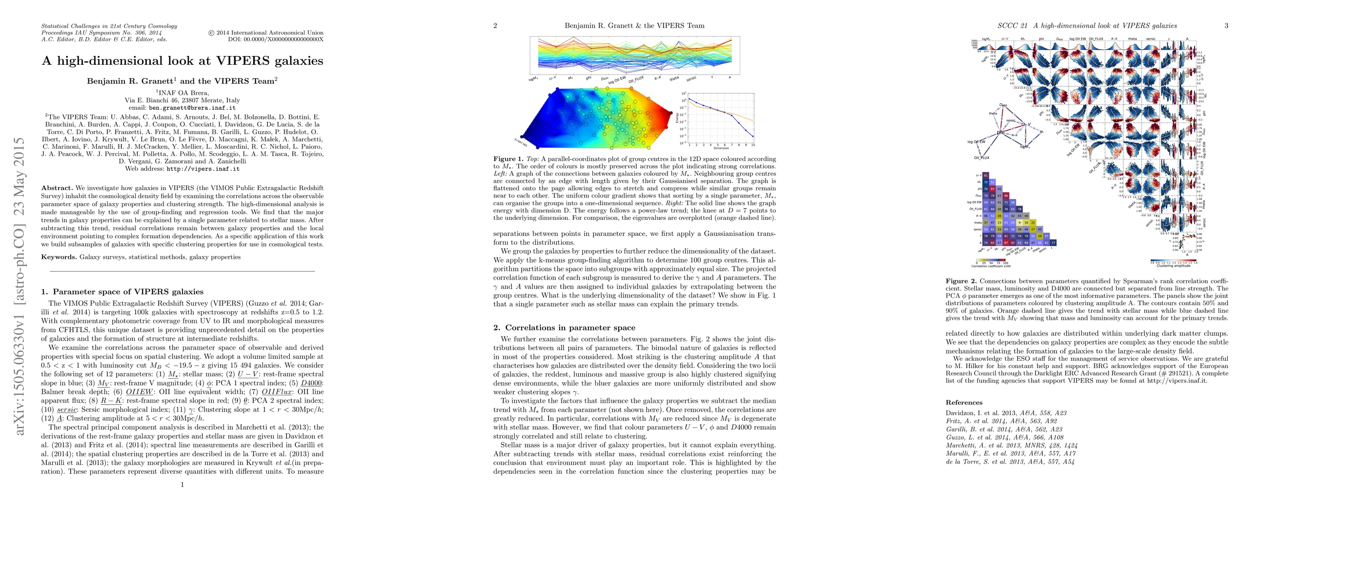We investigate how galaxies in VIPERS (the VIMOS Public Extragalactic Redshift Survey) inhabit the cosmological density field by examining the correlations across the observable parameter space of galaxy properties and clustering strength. The high-dimensional analysis is made manageable by the use of group-finding and regression tools. We find that the major trends in galaxy properties can be explained by a single parameter related to stellar mass. After subtracting this trend, residual correlations remain between galaxy properties and the local environment pointing to complex formation dependencies. As a specific application of this work we build subsamples of galaxies with specific clustering properties for use in cosmological tests.