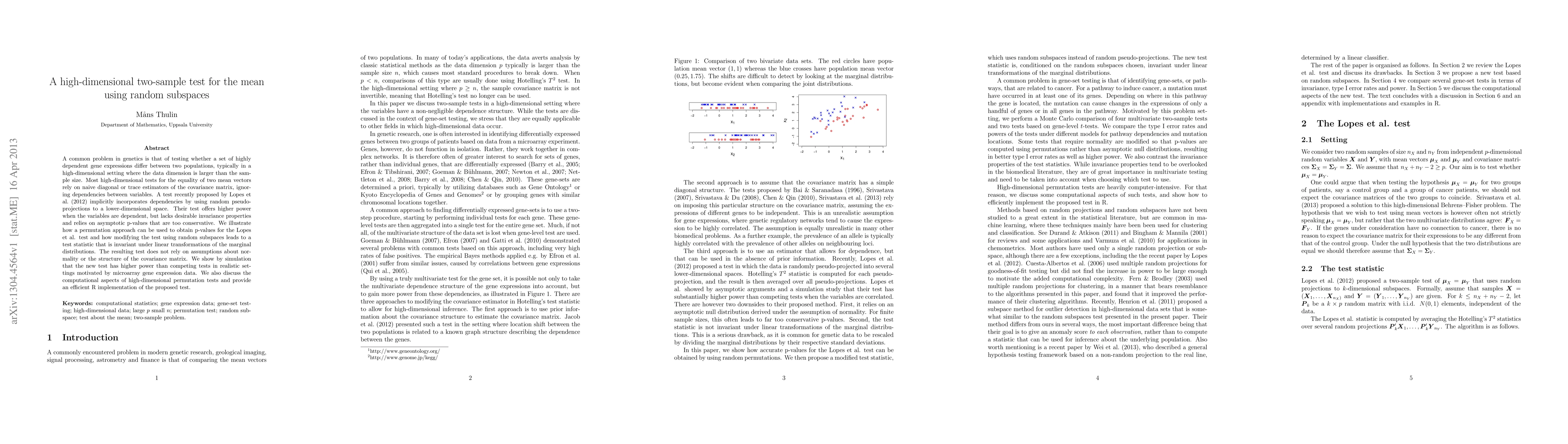 A common problem in genetics is that of testing whether a set of highly dependent gene expressions differ between two populations, typically in a high-dimensional setting where the data dimension is larger than the sample size. Most high-dimensional tests for the equality of two mean vectors rely on naive diagonal or trace estimators of the covariance matrix, ignoring dependencies between variables. A test recently proposed by Lopes et al. (2012) implicitly incorporates dependencies by using random pseudo-projections to a lower-dimensional space. Their test offers higher power when the variables are dependent, but lacks desirable invariance properties and relies on asymptotic p-values that are too conservative. We illustrate how a permutation approach can be used to obtain p-values for the Lopes et al. test and how modifying the test using random subspaces leads to a test statistic that is invariant under linear transformations of the marginal distributions. The resulting test does not rely on assumptions about normality or the structure of the covariance matrix. We show by simulation that the new test has higher power than competing tests in realistic settings motivated by microarray gene expression data. We also discuss the computational aspects of high-dimensional permutation tests and provide an efficient R implementation of the proposed test.